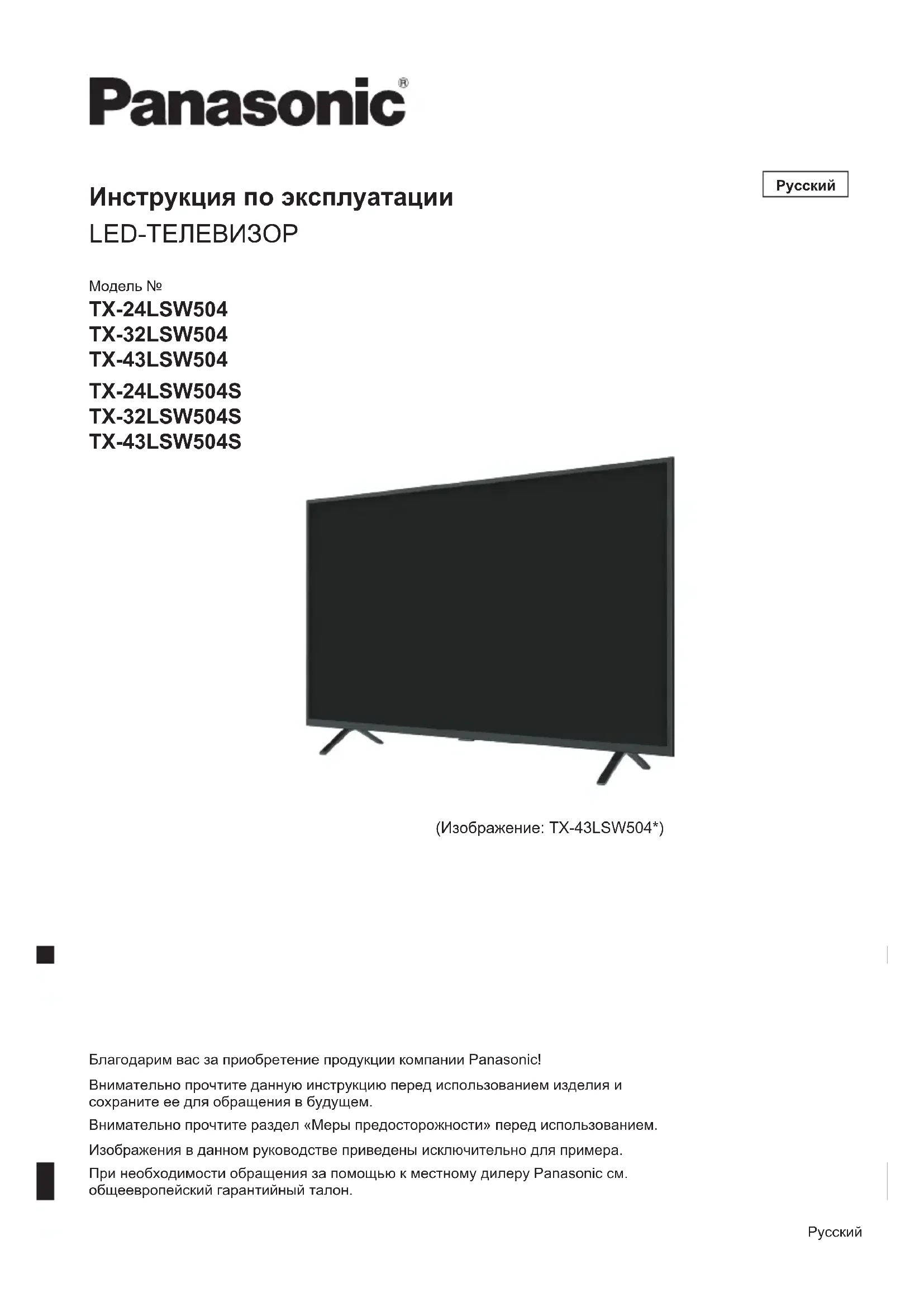 Благодарим вас за приобретение продукции компании Panasonic! Внимательно прочтите данную инструкцию перед использованием изделия и сохраните ее для обращения в будущем. Внимательно прочтите раздел «Меры предосторожности» перед использованием. Изображения в данном руководстве приведены исключительно для примера. При необходимости обращения за помощью к местному дилеру Panasonic см. общеевропейский гарантийный талон. (Изображение: TX-43LSW504*) РусскийРусский