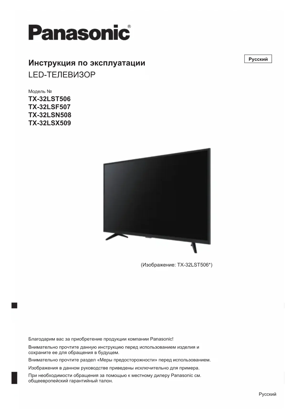 Благодарим вас за приобретение продукции компании Panasonic! Внимательно прочтите данную инструкцию перед использованием изделия и сохраните ее для обращения в будущем. Внимательно прочтите раздел «Меры предосторожности» перед использованием. Изображения в данном руководстве приведены исключительно для примера. При необходимости обращения за помощью к местному дилеру Panasonic см. общеевропейский гарантийный талон. (Изображение: TX-32LST506*) РусскийРусский