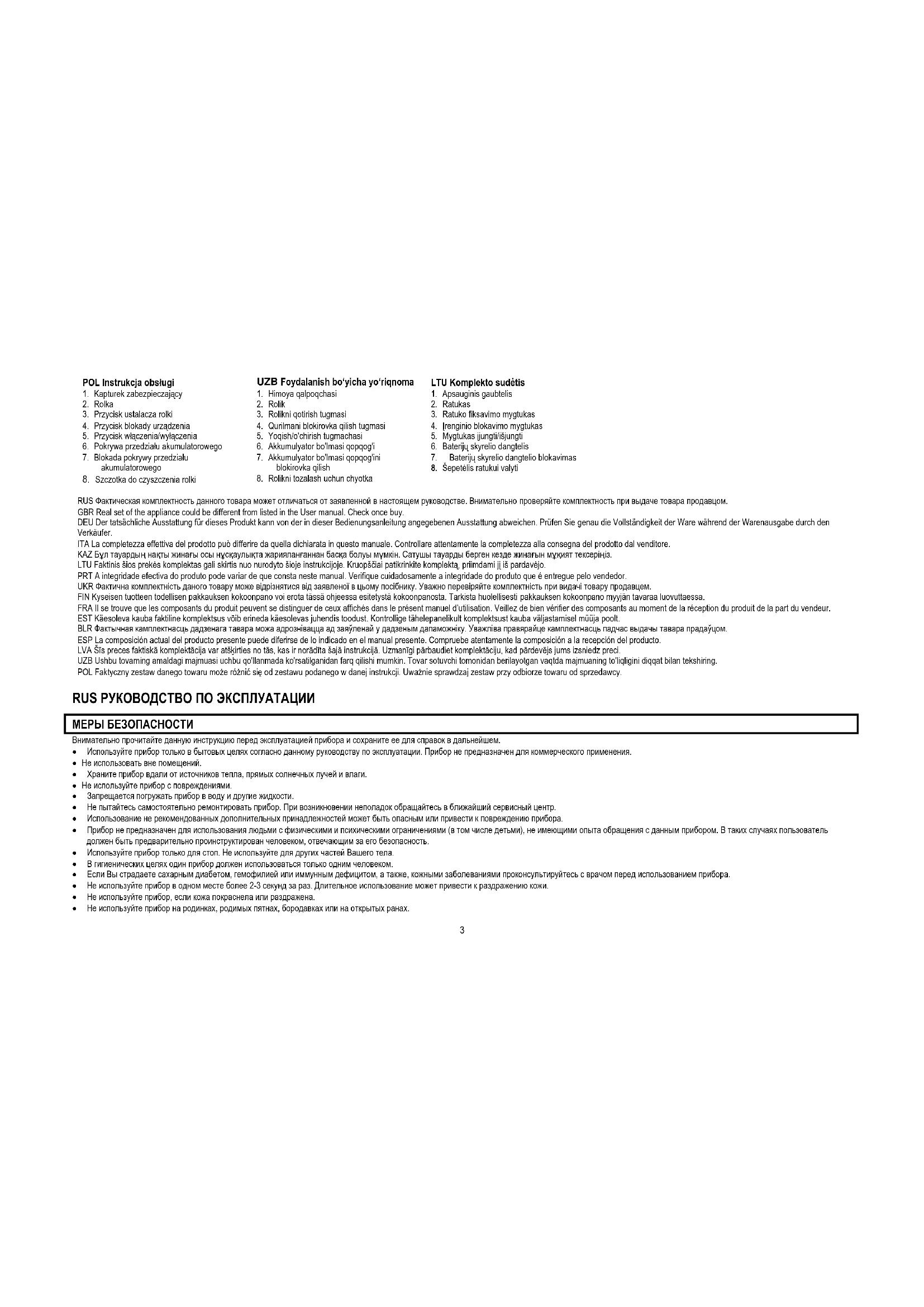 RUS РУКОВОДСТВО ПО ЭКСПЛУАТАЦИИ МЕРЫ БЕЗОПАСНОСТИ Внимательно прочитайте данную инструкцию перед эксплуатацией прибора и сохраните ее для справок в дальнейшем. Используйте прибор только в бытовых целях согласно данному руководству по эксплуатации. Прибор не предназначен для коммерческого применения. Не использовать вне помещений. Храните прибор вдали от источников тепла, прямых солнечных лучей и влаги. Не используйте прибор с повреждениями. Запрещается погружать прибор в воду и другие жидкости. Не пытайтесь самостоятельно ремонтировать прибор. При возникновении неполадок обращайтесь в ближайший сервисный центр. Использование не рекомендованных дополнительных принадлежностей может быть опасным или привести к повреждению прибора. Прибор не предназначен для использования людьми с физическими и психическими ограничениями (в том числе детьми), не имеющими опыта обращения с данным прибором. В таких случаях пользователь должен быть предварительно проинструктирован человеком, отвечающим за его безопасность. Используйте прибор только для стоп. Не используйте для других частей Вашего тела. В гигиенических целях один прибор должен использоваться только одним человеком. Если Вы страдаете сахарным диабетом, гемофилией или иммунным дефицитом, а также, кожными заболеваниями проконсультируйтесь с врачом перед использованием прибора. Не используйте прибор в одном месте более 2-3 секунд за раз. Длительное использование может привести к раздражению кожи. Не используйте прибор, если кожа покраснела или раздражена. Не используйте прибор на родинках, родимых пятнах, бородавках или на открытых ранах.4 Прекратите использование прибора немедленно, если Вы чувствуете боль, дискомфорт или раздражение. Не включайте устройство, если ролик не подсоединен к устройству. Для предотвращения несчастного случая не подносите работающий прибор к волосам, лицу, одежде, проводам и т.д. Надевайте защитный колпачок на ролик, если не используете прибор. Если Вы не используете прибор в течение длительного времени, извлеките из него батарейки. ИСПОЛЬЗОВАНИЕ ПРИБОРА УСТАНОВКА ЭЛЕМЕНТОВ ПИТАНИЯ Снимите крышку аккумуляторного отсека, повернув ее на 90° до щелчка, и затем потянув ее вниз согласно рис. 1 и 2. Вставьте 2 батареи типа АА в отсек для батареек, соблюдая полярность, согласно рис. 3. Закройте крышку аккумуляторного отсека, поверните ее направо на 90° до щелчка и фиксации согласно рис. 4 и 5.