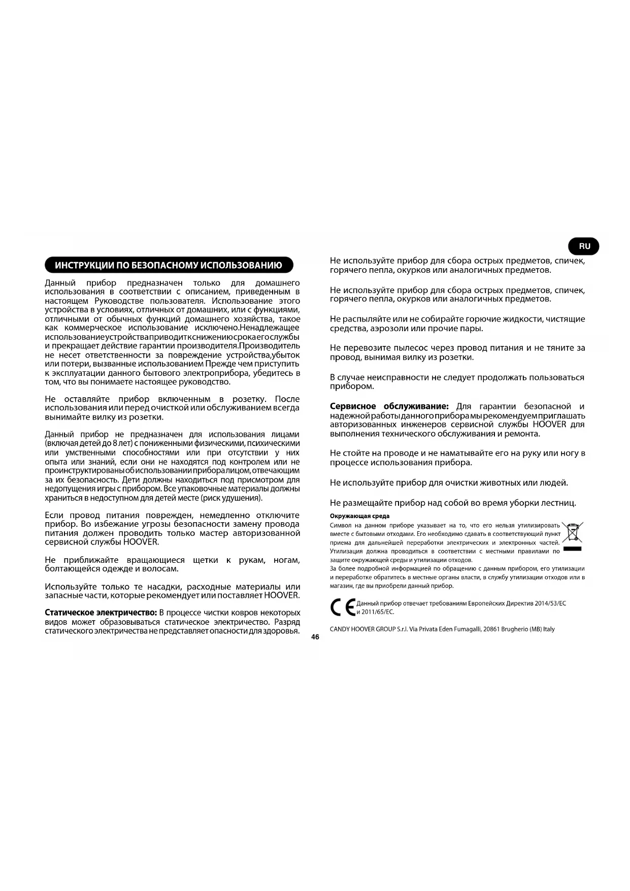 Τα εργοστάσια Hoover έχουν ελεχθεί από ανεξάρτητους φορείς ποιοτικού ελέγχου. Τα προϊόντα μας κατασκευάζονται μέσω ενός συστήματος ποιότητας το οποίο πληροί τις προδιαγραφές του προτύπου ISO 9001. Η ΕΓΓΥΗΣΗ ΣΑΣ Οι όροι ισχύος της εγγύησης της συσκευής καθορίζονται από τον αντιπρόσωπο της χώρας στην οποία έχει πραγματοποιηθεί η πώληση. Περισσότερες πληροφορίες σχετικά με τους όρους εγγύησης μπορείτε να ζητήσετε από τον αντιπρόσωπο που αγοράσατε τη συσκευή. Η προσκόμιση του τιμολογίου ή της απόδειξης αγοράς είναι βασική προϋπόθεση για την ισχύ της εγγύησης. Ο κατασκευαστής διατηρεί το δικαίωμα να επιφέρει αλλαγές χωρίς προγενέστερη ενημέρωση. GR46 ИНСТРУКЦИИ ПО БЕЗОПАСНОМУ ИСПОЛЬЗОВАНИЮ Данный прибор предназначен только для домашнего использования в соответствии с описанием, приведенным в настоящем Руководстве пользователя. Использование этого устройства в условиях, отличных от домашних, или с функциями, отличными от обычных функций домашнего хозяйства, такое как коммерческое использование исключено.Ненадлежащее использование устройства приводит к снижению срока его службы и прекращает действие гарантии производителя.Производитель не несет ответственности за повреждение устройства,убыток или потери, вызванные использованием Прежде чем приступить к эксплуатации данного бытового электроприбора, убедитесь в том, что вы понимаете настоящее руководство. Не оставляйте прибор включенным в розетку. После использования или перед очисткой или обслуживанием всегда вынимайте вилку из розетки. Данный прибор не предназначен для использования лицами (включая детей до 8 лет) с пониженными физическими, психическими или умственными способностями или при отсутствии у них опыта или знаний, если они не находятся под контролем или не проинструктированы об использовании прибора лицом, отвечающим за их безопасность. Дети должны находиться под присмотром для недопущения игры с прибором. Все упаковочные материалы должны храниться в недоступном для детей месте (риск удушения). Если провод питания поврежден, немедленно отключите прибор. Во избежание угрозы безопасности замену провода питания должен проводить только мастер авторизованной сервисной службы HOOVER. Не приближайте вращающиеся щетки к рукам, ногам, болтающейся одежде и волосам. Используйте только те насадки, расходные материалы или запасные части, которые рекомендует или поставляет HOOVER. Статическое электричество: В процессе чистки ковров некоторых видов может образовываться статическое электричество. Разряд статического электричества не представляет опасности для здоровья. Не используйте прибор для сбора острых предметов, спичек, горячего пепла, окурков или аналогичных предметов. Не используйте прибор для сбора острых предметов, спичек, горячего пепла, окурков или аналогичных предметов. Не распыляйте или не собирайте горючие жидкости, чистящие средства, аэрозоли или прочие пары. Не перевозите пылесос через провод питания и не тяните за провод, вынимая вилку из розетки. В случае неисправности не следует продолжать пользоваться