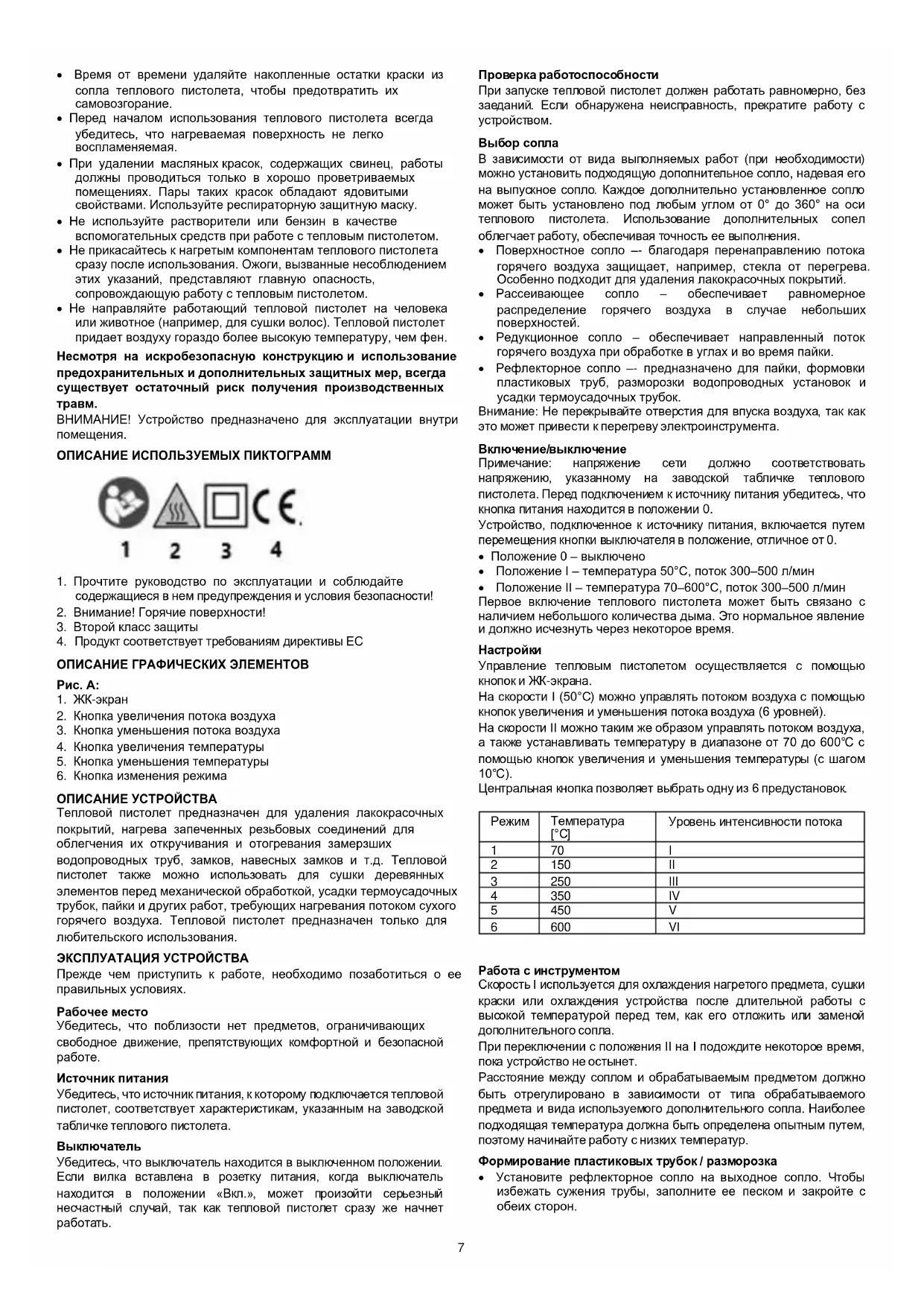 - Положение II – температура 70–600°C, поток 300–500 л/мин Первое включение теплового пистолета может быть связано с наличием небольшого количества дыма. Это нормальное явление и должно исчезнуть через некоторое время.