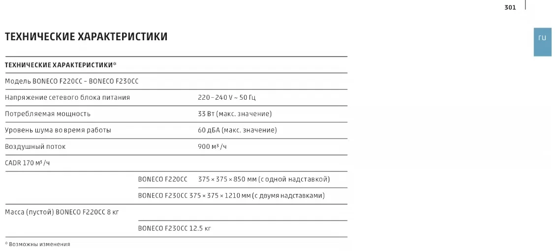 Различие между моделями BONECO F220CC и BONECO F230CC состоит лишь в том, что вариант BONECO F230CC оснащается двумя съем- ными модулями для регулировки высоты. В ентилятор можно использовать без съемного модуля для регулировки высо- ты, с одной надставкой или с двумя надставка- ми. Это позволяет приспособить устройство к своим потребностям. Убедитесь, что решетка установлена пра- вильно, иначе прибор не включится. Обратите внимание, что при первом вклю- чении вентилятора или после исполь- зования в течение некоторого времени, вы можете услышать легкий треск в течение пер- вых нескольких минут работы. Это происходит вследствие получения фильтром HEPA ESP элек- трического заряда, который позволяет ему эф- фективно фильтровать воздух.306