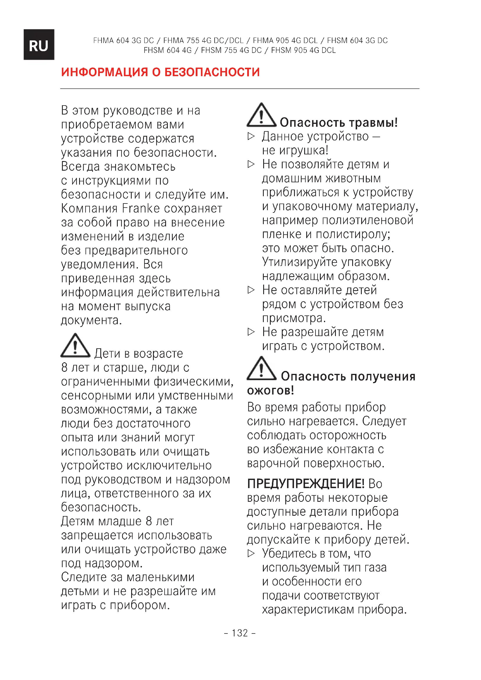 Убедитесь в том, что используемый тип газа и особенности его подачи соответствуют характеристикам прибора.– 133 – FHMA 604 3G DC / FHMA 755 4G DC/DCL / FHMA 905 4G DCL / FHSM 604 3G DC FHSM 604 4G / FHSM 755 4G DC / FHSM 905 4G DCL