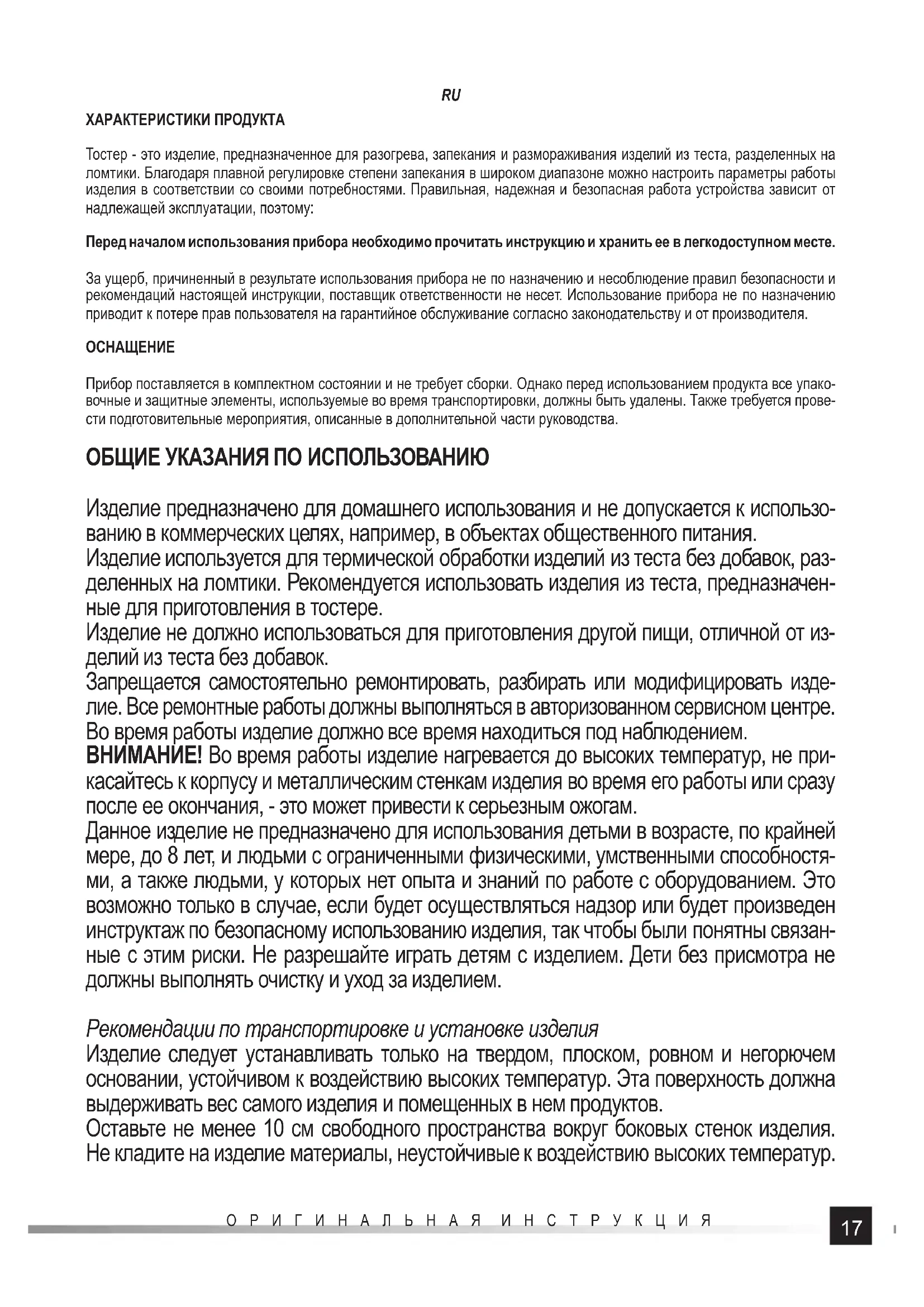 Прибор поставляется в комплектном состоянии и не требует сборки. Однако перед использованием продукта все упако- вочные и защитные элементы, используемые во время транспортировки, должны быть удалены. Также требуется прове- сти подготовительные мероприятия, описанные в дополнительной части руководства. ОБЩИЕ УКАЗАНИЯ ПО ИСПОЛЬЗОВАНИЮ Изделие предназначено для домашнего использования и не допускается к использо- ванию в коммерческих целях, например, в объектах общественного питания. Изделие используется для термической обработки изделий из теста без добавок, раз- деленных на ломтики. Рекомендуется использовать изделия из теста, предназначен- ные для приготовления в тостере. Изделие не должно использоваться для приготовления другой пищи, отличной от из- делий из теста без добавок. Запрещается самостоятельно ремонтировать, разбирать или модифицировать изде- лие. Все ремонтные работы должны выполняться в авторизованном сервисном центре. Во время работы изделие должно все время находиться под наблюдением. ВНИМАНИЕ! Во время работы изделие нагревается до высоких температур, не при- касайтесь к корпусу и металлическим стенкам изделия во время его работы или сразу после ее окончания, - это может привести к серьезным ожогам. Данное изделие не предназначено для использования детьми в возрасте, по крайней мере, до 8 лет, и людьми с ограниченными физическими, умственными способностя- ми, а также людьми, у которых нет опыта и знаний по работе с оборудованием. Это возможно только в случае, если будет осуществляться надзор или будет произведен инструктаж по безопасному использованию изделия, так чтобы были понятны связан- ные с этим риски. Не разрешайте играть детям с изделием. Дети без присмотра не должны выполнять очистку и уход за изделием. Рекомендации по транспортировке и установке изделия Изделие следует устанавливать только на твердом, плоском, ровном и негорючем основании, устойчивом к воздействию высоких температур. Эта поверхность должна выдерживать вес самого изделия и помещенных в нем продуктов. Оставьте не менее 10 см свободного пространства вокруг боковых стенок изделия. Не кладите на изделие материалы, неустойчивые к воздействию высоких температур.18 ОРИГИНАЛЬНАЯ ИНСТРУКЦИЯ