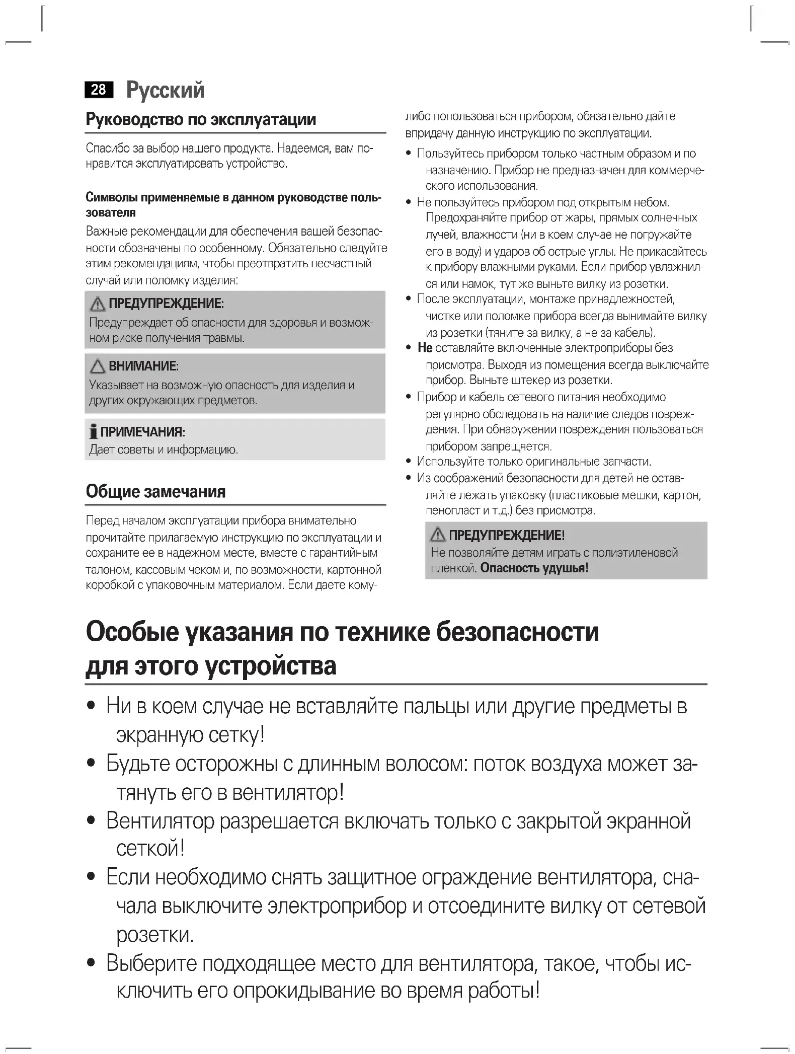 - Из соображений безопасности для детей не остав- ляйте лежать упаковку (пластиковые мешки, картон, пенопласт и т.д.) без присмотра. ПРЕДУПРЕЖДЕНИЕ! Не позволяйте детям играть с полиэтиленовой пленкой. Опасность удушья! Особые указания по технике безопасности для этого устройства