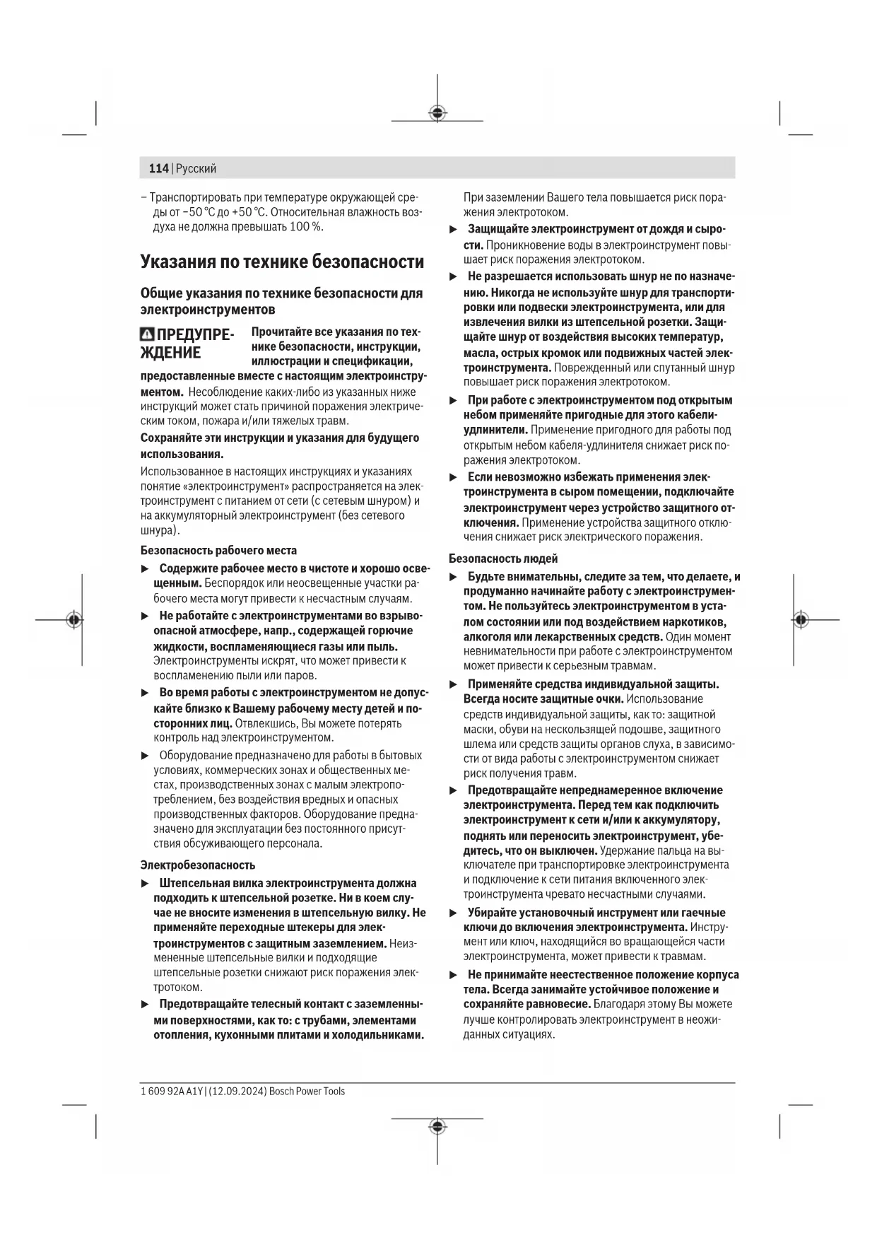 – при разгрузке/погрузке не допускается использова- ние любого вида техники, работающей по принципу зажима упаковки – подробные требования к условиям транспортировки смотрите в ГОСТ15150-69 (Условие5) Bosch Power Tools 1 609 92A A1Y | (12.09.2024)114 | Русский – Транспортировать при температуре окружающей сре- ды от −50°С до +50°С. Относительная влажность воз- духа не должна превышать 100%. Указания по технике безопасности Общие указания по технике безопасности для электроинструментов