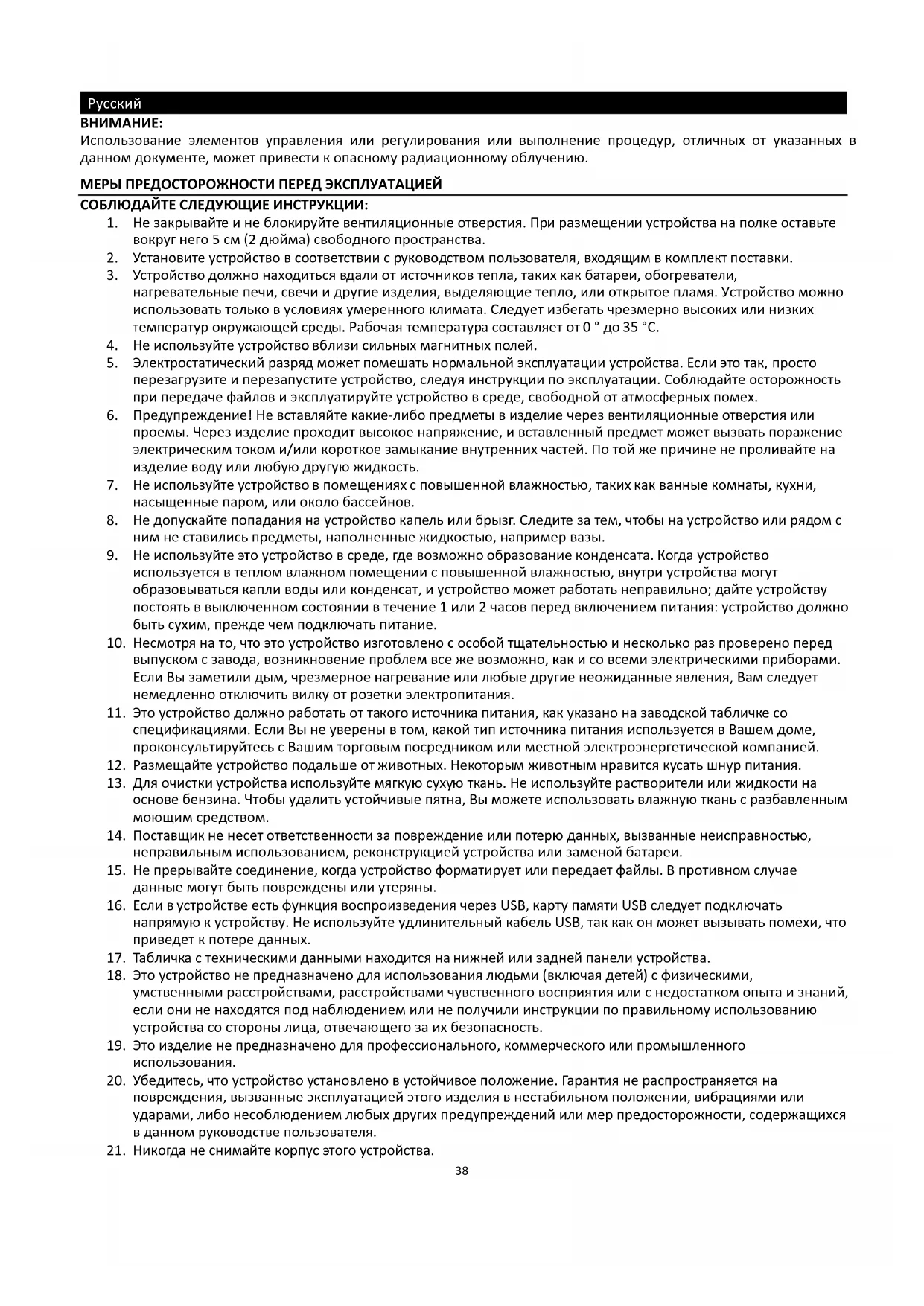21. Никогда не снимайте корпус этого устройства.39