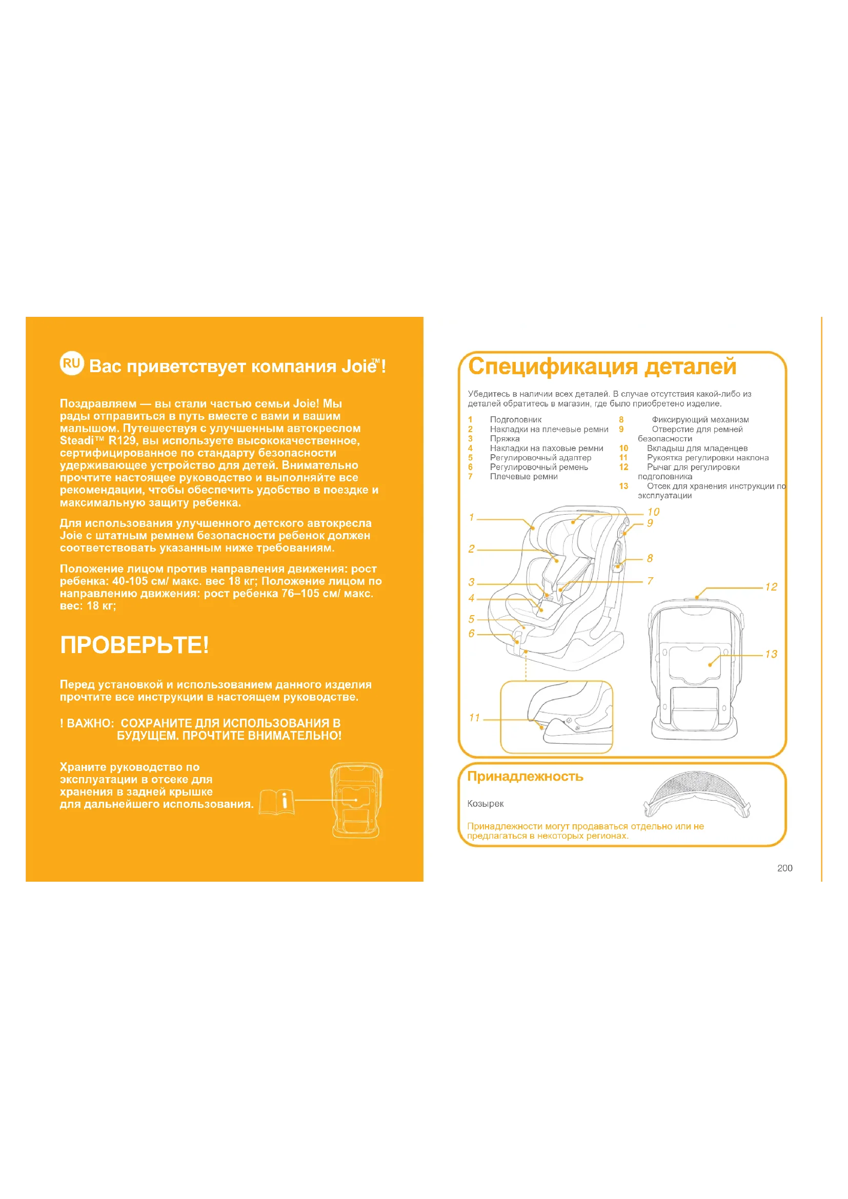 Поздравляем — вы стали частью семьи Joie! Мы рады отправиться в путь вместе с вами и вашим малышом. Путешествуя с улучшенным автокреслом Steadi™ R129, вы используете высококачественное, сертифицированное по стандарту безопасности удерживающее устройство для детей. Внимательно прочтите настоящее руководство и выполняйте все рекомендации, чтобы обеспечить удобство в поездке и максимальную защиту ребенка.Для использования улучшенного детского автокресла Joie с штатным ремнем безопасности ребенок должен соответствовать указанным ниже требованиям.Положение лицом против направления движения: рост ребенка: 40-105 см/ макс. вес 18 кг; Положение лицом по направлению движения: рост ребенка 76–105 см/ макс. вес: 18 кг; Перед установкой и использованием данного изделия прочтите все инструкции в настоящем руководстве.! ВАЖНО: СОХРАНИТЕ ДЛЯ ИСПОЛЬЗОВАНИЯ В БУДУЩЕМ. ПРОЧТИТЕ ВНИМАТЕЛЬНО!Храните руководство по эксплуатации в отсеке для хранения в задней крышке для дальнейшего использования.