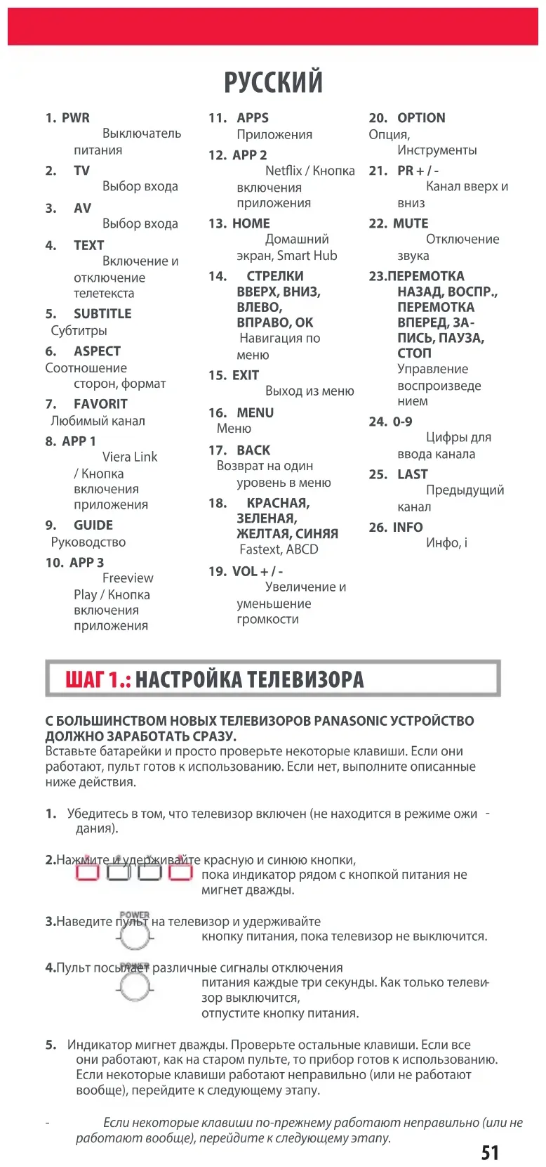 Инфо, i 712188_Panasonic_manual URC4914_RDN1091120.indd 51712188_Panasonic_manual URC4914_RDN1091120.indd 51 09-11-2020 13:1509-11-2020 13:1552 НАСТРОЙКА НОВЫХ ФУНКЦИЙ НА ПУЛЬТЕOne For All может выполнять функции других пультов ДУ. Положите старый пульт на ровную поверхность лицевой стороной к One For All.2. Настройка функций. Нажмите и удерживайте ЗЕЛЕНУЮ и ЖЕЛТУЮ клавиши, пока индикатор не мигнет дважды.3. Нажмите 975. Индикатор мигнет дважды.4. Нажмите клавишу на пульте One For All, для которой нужно настроить новые функции, например, VOL + (Громк. +). Индикатор кратковременно мигнет.5. Нажмите клавишу на старом пульте, функцию которой нужно настроить на новом, например VOL+ (Громк. +) на пульте аудиоустройства.6. Двойное мигание: процедура выполнена. Повторите, начи ная с шага 4, для следующей настраиваемой кнопки. Долгое мигание: повторите описанные действия, начиная с шага 4.7. Настроив все нужные функции, нажмите кнопку ОК и удер-живайте ее в течение 3 секунд. Индикатор мигнет дважды.УДАЛЕНИЕ НАСТРОЕННЫХ ФУНКЦИЙ 1. Нажмите и удерживайте ЗЕЛЕНУЮ и ЖЕЛТУЮ кнопки, пока индикатор не мигнет дважды.2. Нажмите 976.3. Дважды нажмите клавишу, функцию которой нужно сбросить. Индикатор мигнет дважды, и клавише будет назначена исходная функция. НАСТРОЙКА ФУНКЦИЙ НЕКОТОРЫЕ КЛАВИШИ РАБОТАЮТ НЕПРАВИЛЬНО?Если некоторые клавиши работают неправильно (или не работают вообще), перейдите к следующему этапу.1. Убедитесь в том, что телевизор включен (не находится в режиме ожидания).2. Нажмите и удерживайте КРАСНУЮ и СИНЮЮ кла-виши, пока индикатор рядом с кнопкой питания не мигнет дважды.3. Наведите пульт на телевизор и удерживайте одну из неправильно работающих клавиш, например MENU (Меню). 4. Пульт посылает сигнал каждые три секунды.5. После того как нужная функция (в данном случае MENU (Меню) отобразится на экране, отпустите клавишу.6. Когда индикатор мигнет дважды, пульт будет готов к работе. ШАГ 2.: ЧТО ДЕЛАТЬ, ЕСЛИ УСТРОЙСТВО НЕВЕРНО НАСТРОИЛОСЬ НА ЭТАПЕ 1?