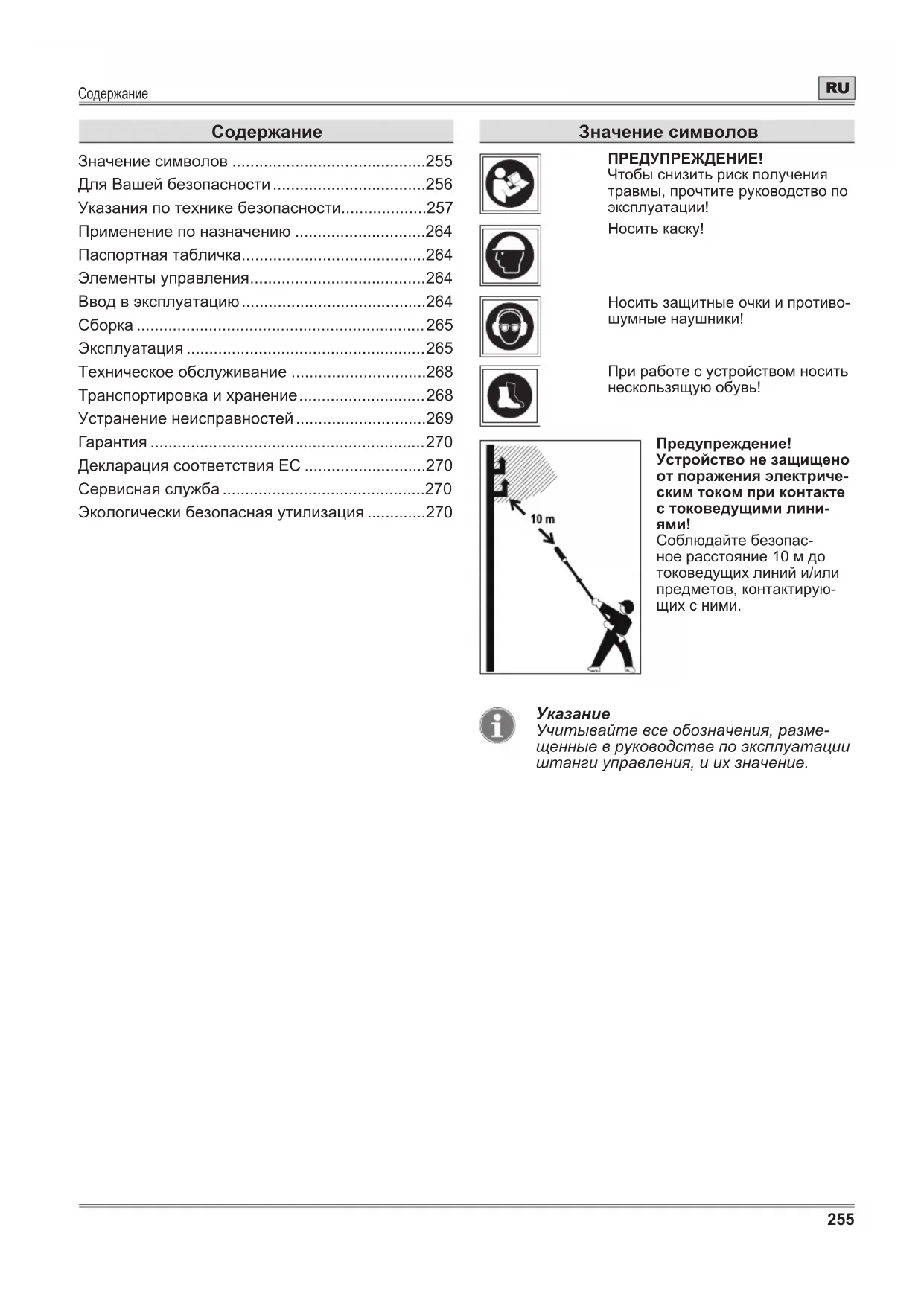 - Экологически безопасная утилизация Значениесимволов ПРЕДУПРЕЖДЕНИЕ! Чтобы снизить риск получения травмы, прочтите руководство по эксплуатации! Носить каску! Носить защитные очки и противо- шумные наушники! При работе с устройством носить нескользящую обувь! Предупреждение! Устройствонезащищено отпораженияэлектриче- скимтокомприконтакте стоковедущимилини- p. 270