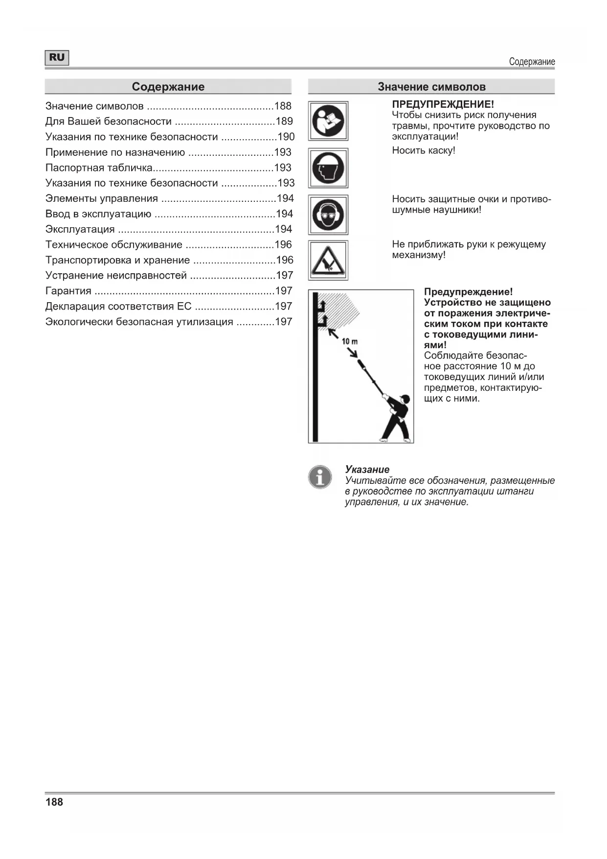 - Экологически безопасная утилизация Значение символов ПРЕДУПРЕЖДЕНИЕ! Чтобы снизить риск получения травмы, прочтите руководство по эксплуатации! Носить каску! Носить защитные очки и противо- шумные наушники! Не приближать руки к режущему p. 197