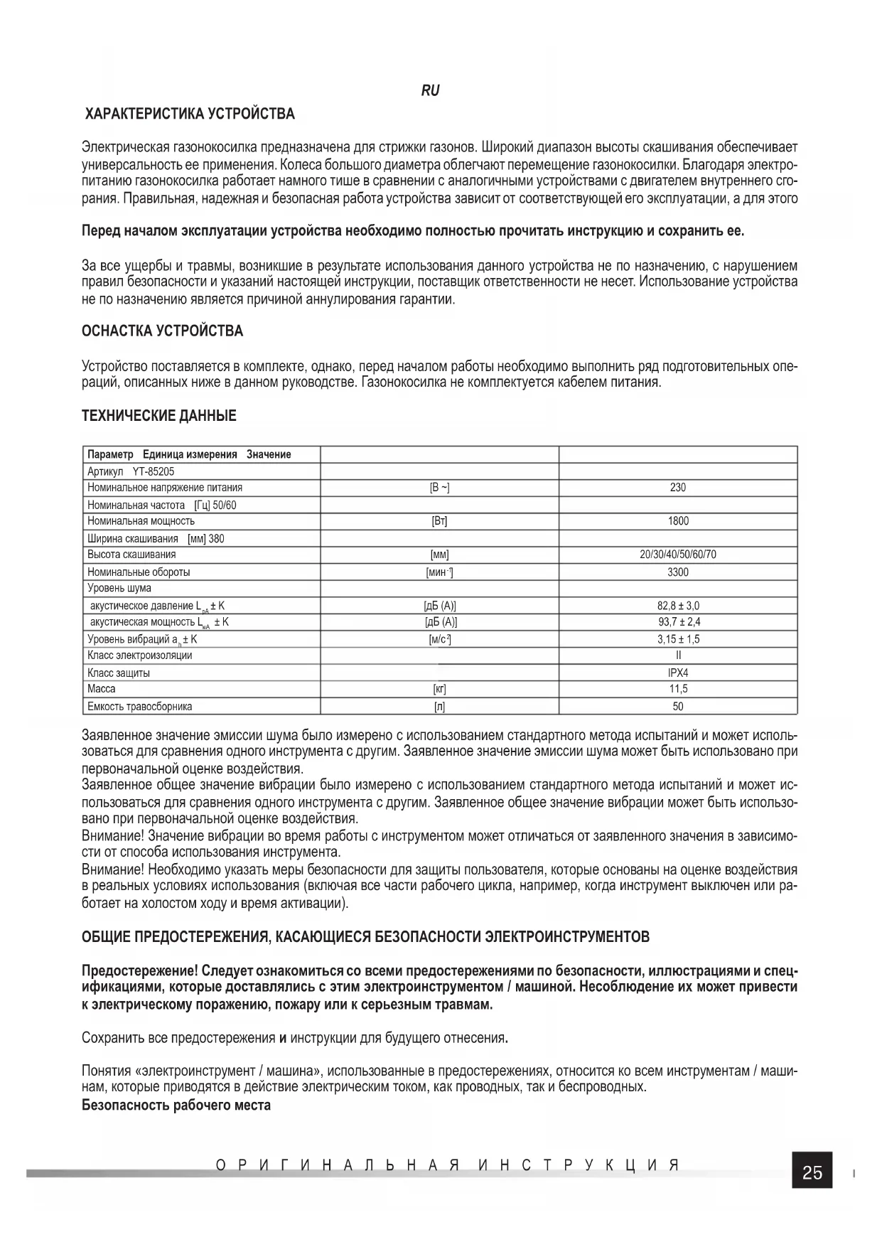 ] 3,15 ± 1,5 Класс электроизоляции II Класс защиты IPX4 Масса [кг] 11,5 Емкость травосборника [л]50 Заявленное значение эмиссии шума было измерено с использованием стандартного метода испытаний и может исполь- зоваться для сравнения одного инструмента с другим. Заявленное значение эмиссии шума может быть использовано при первоначальной оценке воздействия. Заявленное общее значение вибрации было измерено с использованием стандартного метода испытаний и может ис- пользоваться для сравнения одного инструмента с другим. Заявленное общее значение вибрации может быть использо- вано при первоначальной оценке воздействия. Внимание! Значение вибрации во время работы с инструментом может отличаться от заявленного значения в зависимо- сти от способа использования инструмента. Внимание! Необходимо указать меры безопасности для защиты пользователя, которые основаны на оценке воздействия в реальных условиях использования (включая все части рабочего цикла, например, когда инструмент выключен или ра- ботает на холостом ходу и время активации). ОБЩИЕ ПРЕДОСТЕРЕЖЕНИЯ, КАСАЮЩИЕСЯ БЕЗОПАСНОСТИ ЭЛЕКТРОИНСТРУМЕНТОВ Предостережение! Следует ознакомиться со всеми предостережениями по безопасности, иллюстрациями и спец- ификациями, которые доставлялись с этим электроинструментом / машиной. Несоблюдение их может привести к электрическому поражению, пожару или к серьезным травмам. Сохранить все предостережения и инструкции для будущего отнесения. Понятия «электроинструмент / машина», использованные в предостережениях, относится ко всем инструментам / маши- нам, которые приводятся в действие электрическим током, как проводных, так и беспроводных. Безопасность рабочего места26 ОРИГИНАЛЬНАЯ ИНСТРУКЦИЯ