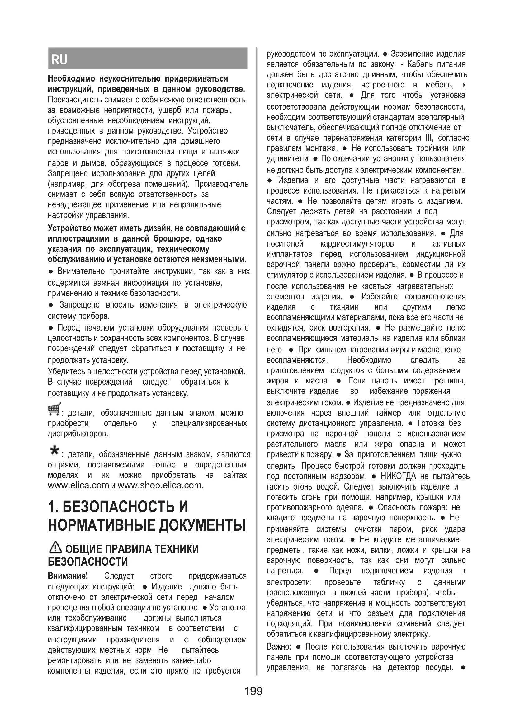 Dacă după verificările de mai sus defecţiunea persistă, contactaţi cel mai apropiat Serviciu de asistenţă tehnică. 198RU Необходимо неукоснительно придерживаться инструкций, приведенных в данном руководстве. Производитель снимает с себя всякую ответственность за возможные неприятности, ущерб или пожары, обусловленные несоблюдением инструкций, приведенных в данном руководстве. Устройство предназначено исключительно для домашнего использования для приготовления пищи и вытяжки паров и дымов, образующихся в процессе готовки. Запрещено использование для других целей (например, для обогрева помещений). Производитель снимает с себя всякую ответственность за ненадлежащее применение или неправильные настройки управления. Устройство может иметь дизайн, не совпадающий с иллюстрациями в данной брошюре, однако указания по эксплуатации, техническому обслуживанию и установке остаются неизменными. ● Внимательно прочитайте инструкции, так как в них содержится важная информация по установке, применению и технике безопасности. ● Запрещено вносить изменения в электрическую систему прибора. ● Перед началом установки оборудования проверьте целостность и сохранность всех компонентов. В случае повреждений следует обратиться к поставщику и не продолжать установку. Убедитесь в целостности устройства перед установкой. В случае повреждений следует обратиться к поставщику и не продолжать установку. : детали, обозначенные данным знаком, можно приобрести отдельно у специализированных дистрибьюторов. : детали, обозначенные данным знаком, являются опциями, поставляемыми только в определенных моделях и их можно приобретать на сайтах www.elica.com и www.shop.elica.com.