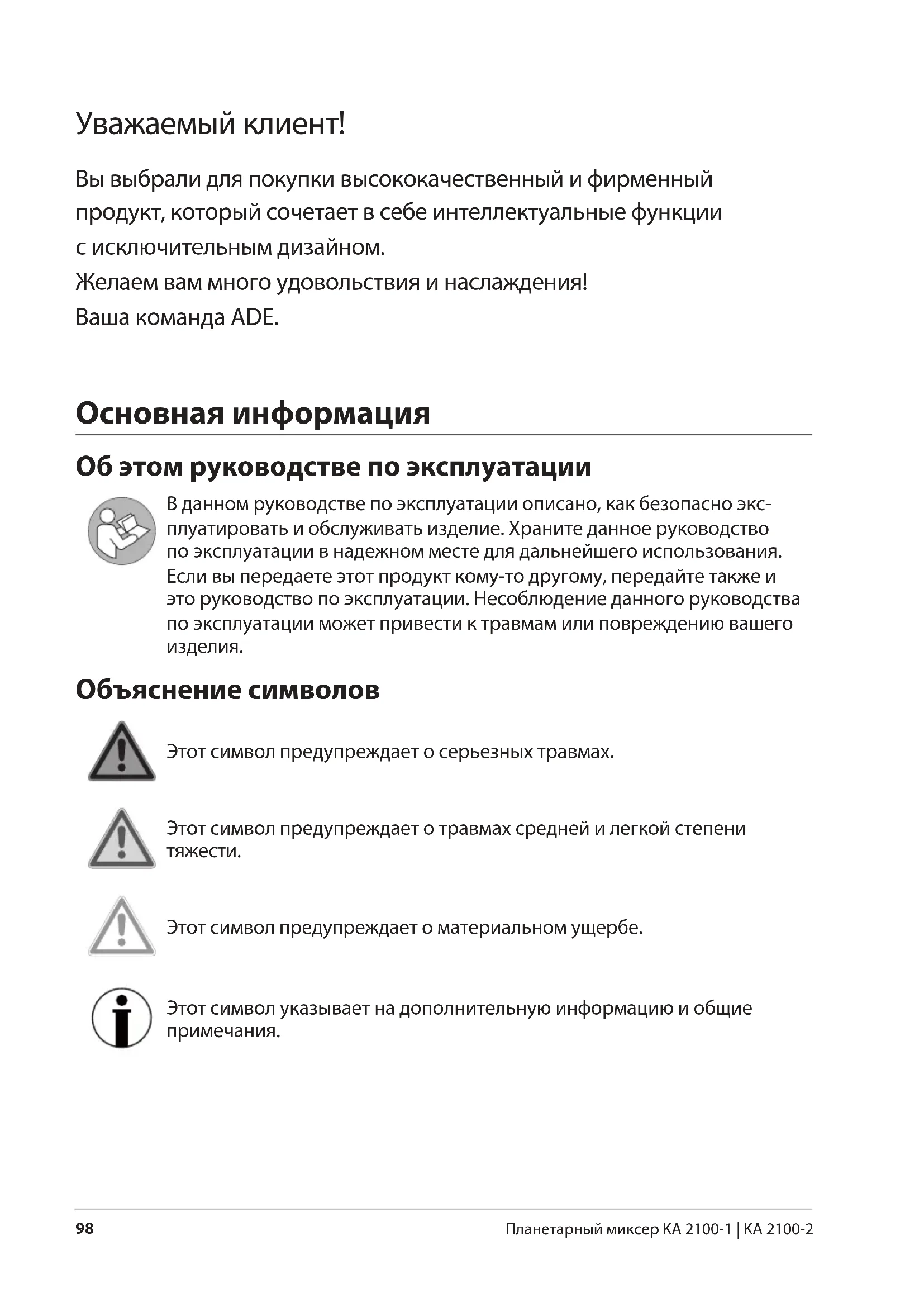 Планетарный миксер KA 2100-1 | KA 2100-2 Уважаемый клиент! Вы выбрали для покупки высококачественный и фирменный продукт, который сочетает в себе интеллектуальные функции с исключительным дизайном. Желаем вам много удовольствия и наслаждения! Ваша команда ADE. Основная информация Об этом руководстве по эксплуатации В данном руководстве по эксплуатации описано, как безопасно экс- плуатировать и обслуживать изделие. Храните данное руководство по эксплуатации в надежном месте для дальнейшего использования. Если вы передаете этот продукт кому-то другому, передайте также и это руководство по эксплуатации. Несоблюдение данного руководства по эксплуатации может привести к травмам или повреждению вашего