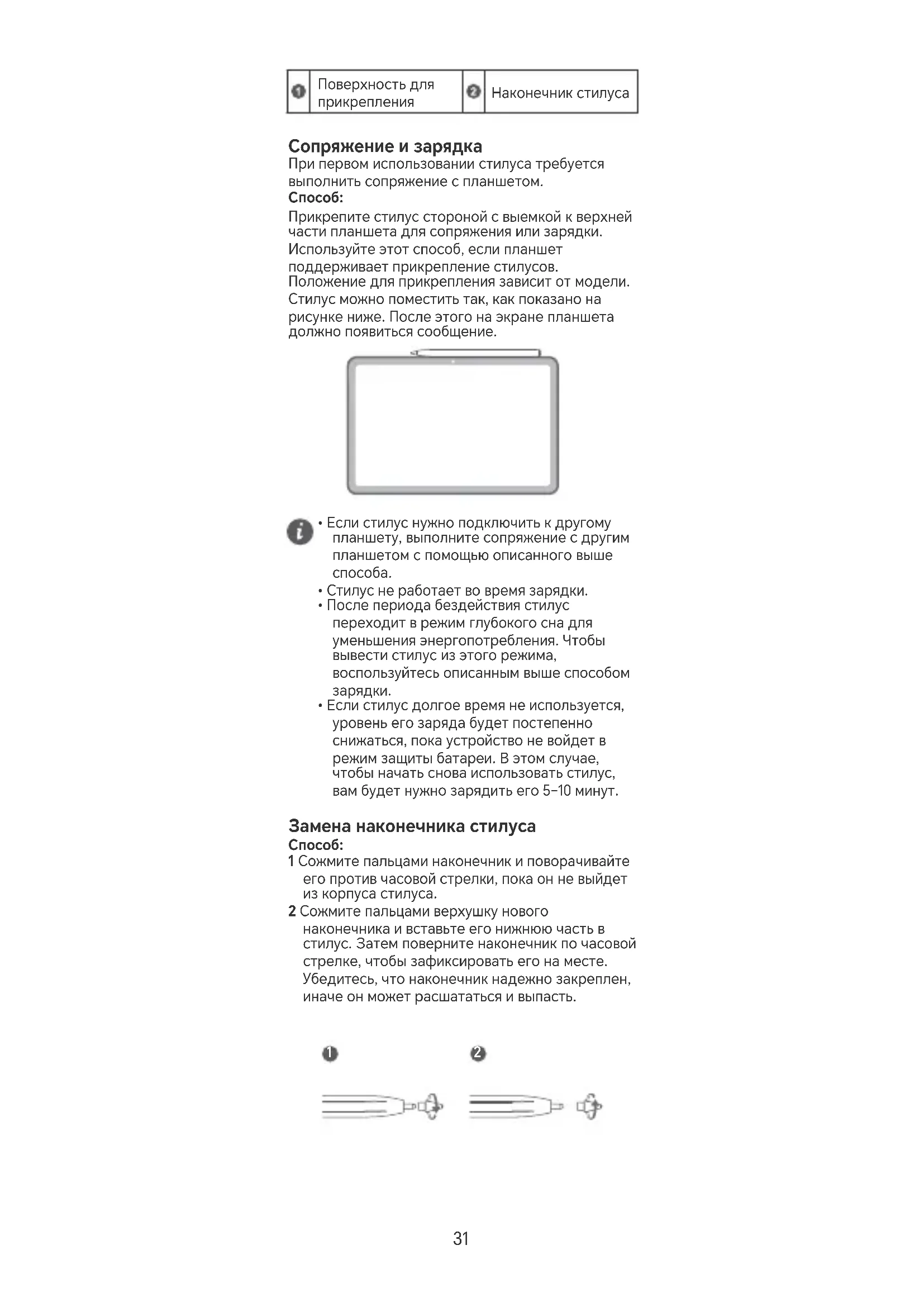 30Поверхность для прикрепления Наконечник стилуса Сопряжение и зарядка При первом использовании стилуса требуется выполнить сопряжение с планшетом.
