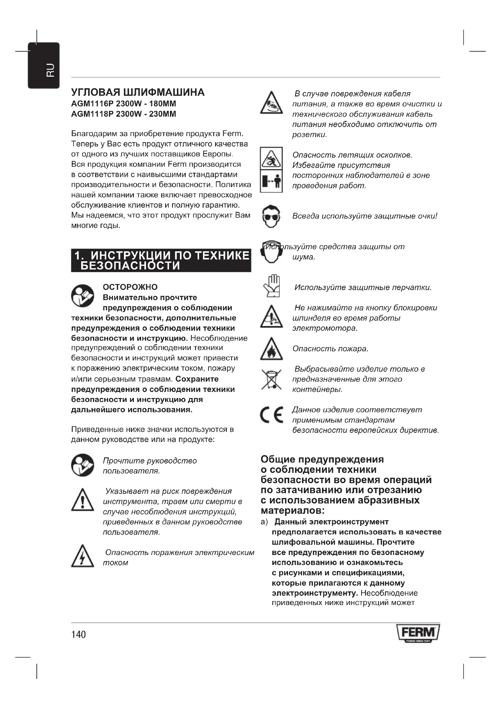 Используйте защитные перчатки. Не нажимайте на кнопку блокировки шпинделя во время работы электромотора. Опасность пожара. Выбрасывайте изделие только в предназначенные для этого контейнеры. Данное изделие соответствует применимым стандартам безопасности европейских директив. Общие предупреждения о соблюдении техники безопасности во время операций по затачиванию или отрезанию с использованием абразивных материалов: a) Данный электроинструмент предполагается использовать в качестве шлифовальной машины. Прочтите все предупреждения по безопасному использованию и ознакомьтесь с рисунками и спецификациями, которые прилагаются к данному электроинструменту. Несоблюдение приведенных ниже инструкций может141