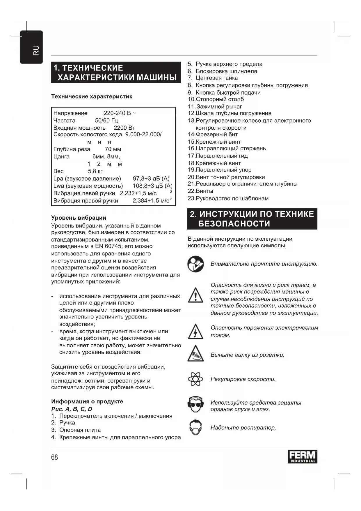 RU1 . ТЕХНИЧЕСКИЕ ХАРАКТЕРИСТИКИ МАШИНЫ Технические характеристик Напряжение 220-240 В ~ Частота 50/60 Гц Входная мощность 2200 Вт Скорость холостого хода 9.000-22.000/