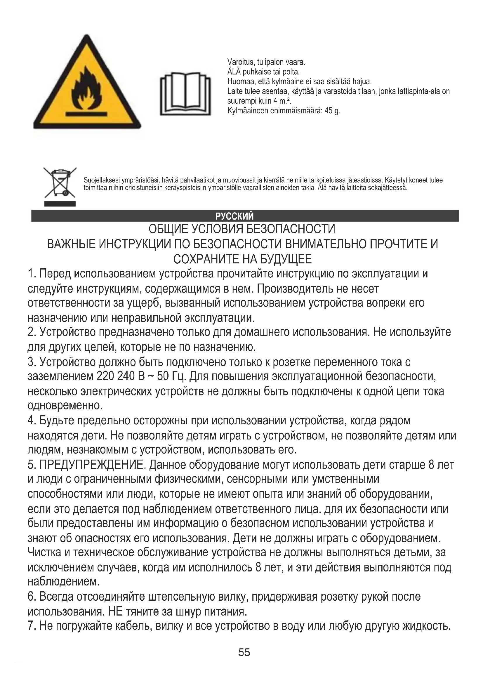 и люди с ограниченными физическими, сенсорными или умственными способностями или люди, которые не имеют опыта или знаний об оборудовании, если это делается под наблюдением ответственного лица. для их безопасности или были предоставлены им информацию о безопасном использовании устройства и знают об опасностях его использования. Дети не должны играть с оборудованием. Чистка и техническое обслуживание устройства не должны выполняться детьми, за исключением случаев, когда им исполнилось 8 лет, и эти действия выполняются под наблюдением.