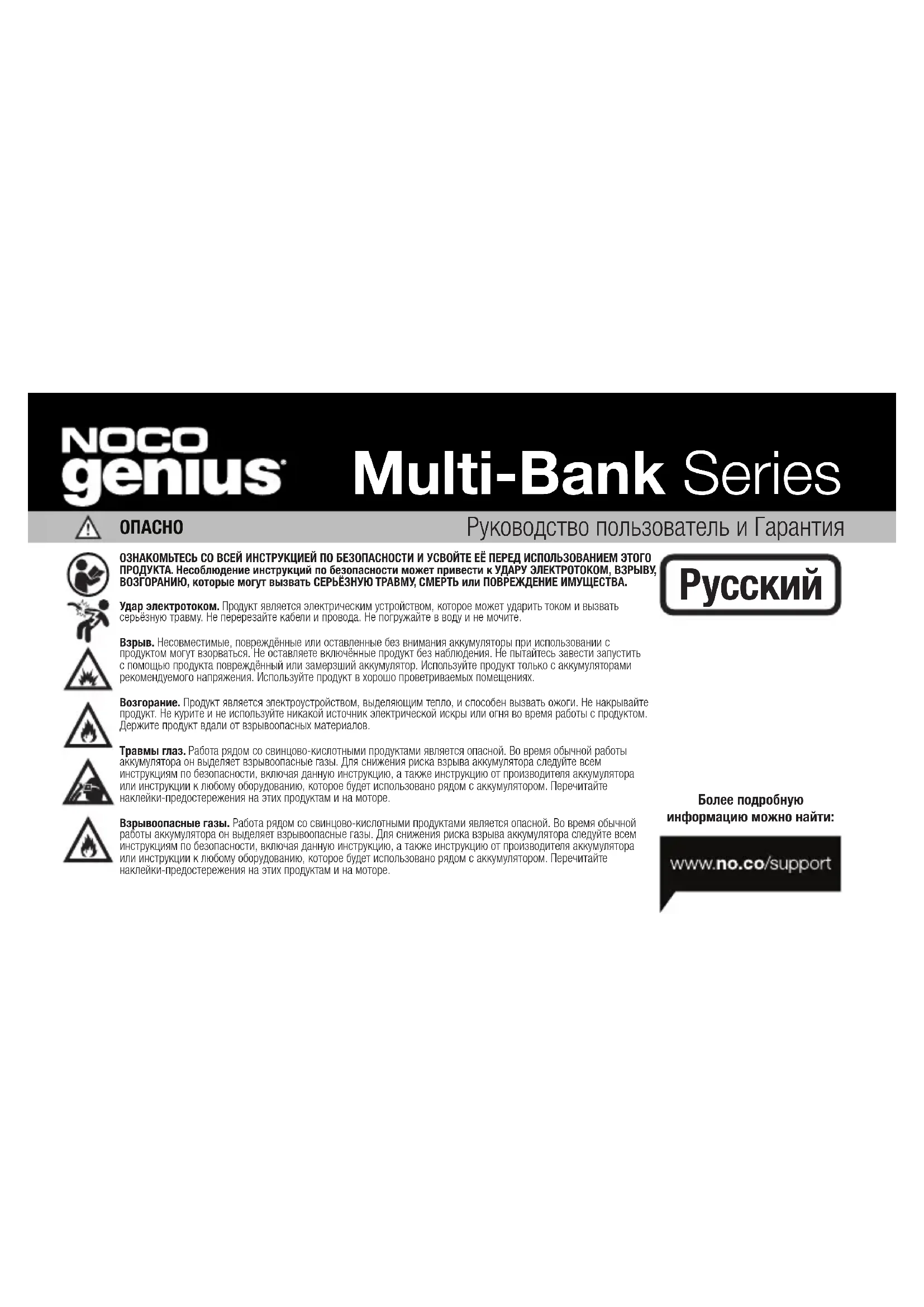 ОЗНАКОМЬТЕСЬ СО ВСЕЙ ИНСТРУКЦИЕЙ ПО БЕЗОПАСНОСТИ И УСВОЙТЕ ЕЁ ПЕРЕД ИСПОЛЬЗОВАНИЕМ ЭТОГО ПРОДУКТА. Несоблюдение инструкций по безопасности может привести к УДАРУ ЭЛЕКТРОТОКОМ, ВЗРЫВУ, ВОЗГОРАНИЮ, которые могут вызвать СЕРЬЁЗНУЮ ТРАВМУ, СМЕРТЬ или ПОВРЕЖДЕНИЕ ИМУЩЕСТВА. Удар электротоком. Продукт является электрическим устройством, которое может ударить током и вызвать серьёзную травму. Не перерезайте кабели и провода. Не погружайте в воду и не мочите. Взрыв. Несовместимые, повреждённые или оставленные без внимания аккумуляторы при использовании с продуктом могут взорваться. Не оставляете включённые продукт без наблюдения. Не пытайтесь завести запустить с помощью продукта повреждённый или замерзший аккумулятор. Используйте продукт только с аккумуляторами рекомендуемого напряжения. Используйте продукт в хорошо проветриваемых помещениях. Возгорание. Продукт является электроустройством, выделяющим тепло, и способен вызвать ожоги. Не накрывайте продукт. Не курите и не используйте никакой источник электрической искры или огня во время работы с продуктом. Держите продукт вдали от взрывоопасных материалов. Травмы глаз. Работа рядом со свинцово-кислотными продуктами является опасной. Во время обычной работы аккумулятора он выделяет взрывоопасные газы. Для снижения риска взрыва аккумулятора следуйте всем инструкциям по безопасности, включая данную инструкцию, а также инструкцию от производителя аккумулятора или инструкции к любому оборудованию, которое будет использовано рядом с аккумулятором. Перечитайте наклейки-предостережения на этих продуктам и на моторе. Взрывоопасные газы. Работа рядом со свинцово-кислотными продуктами является опасной. Во время обычной работы аккумулятора он выделяет взрывоопасные газы. Для снижения риска взрыва аккумулятора следуйте всем инструкциям по безопасности, включая данную инструкцию, а также инструкцию от производителя аккумулятора или инструкции к любому оборудованию, которое будет использовано рядом с аккумулятором. Перечитайте наклейки-предостережения на этих продуктам и на моторе. Более подробную информацию можно найти: Multi-Bank Series PусскийО Genius Multi-Bank. NOCO Genius Multi-Bank представляет собой одну из самых инновационных и передовых технологий на рынке, которая делает любой процесс зарядки простым и легким. Вполне возможно, что это зарядное устройство является самым безопасным и эффективным из тех, которые вы когда- либо будете использовать. Серия Genius multi-bank создана для зарядки всех типов свинцово-кислотных аккумуляторных батарей на 6 В и 12 В, включая: аккумулятор на жидкостных элементах (затопленный), гелевый, MF (необслуживаемый), CA (кальциевый), EFB (усовершенствованный затопленный аккумулятор) и AGM (с пропитанными стекловатными матами), а кроме того, литиевых аккумуляторных батарей (LiFePO4) на 12 В. Также она подходит для зарядки аккумуляторов емкостью до 40 Ампер-часов и поддержки всех размеров аккумуляторов. Начало работы. Перед использованием зарядного устройства внимательно ознакомьтесь с указанными производителем конкретными мерами предосторожности и рекомендуемыми величинами зарядного тока для аккумулятора. Перед зарядкой обязательно выясните напряжение и химический состав аккумулятора, ознакомившись с руководством пользователя аккумулятора. Установка. Важно помнить 