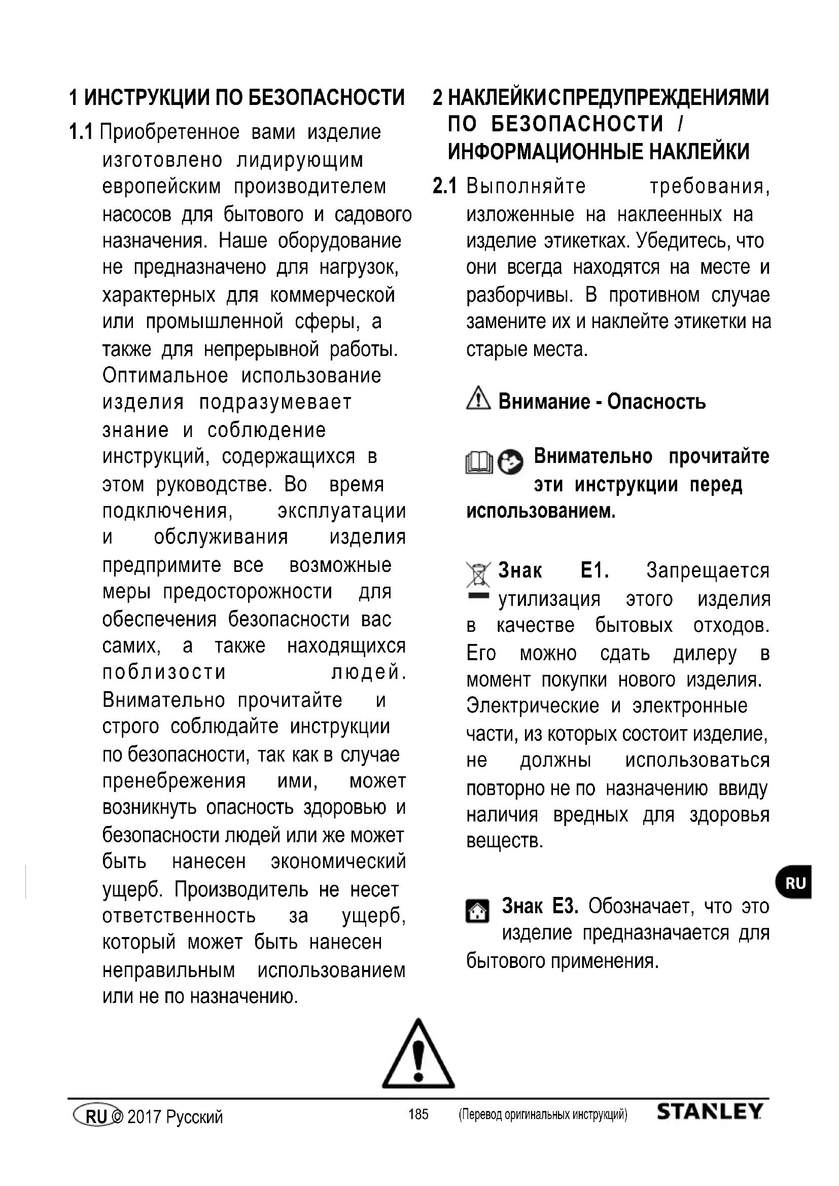Знак E3. Обозначает, что это изделие предназначается для бытового применения.186 187 (Перевод оригинальных инструкций) RU © 2017 Русский (Перевод оригинальных инструкций) © 2017 Русский
