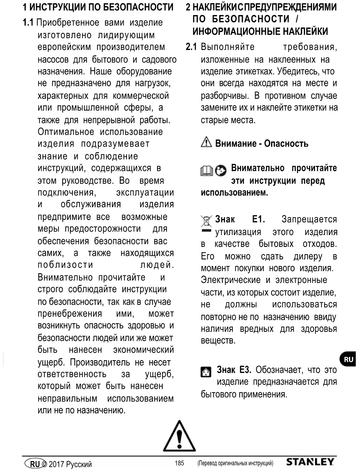 изготовлено лидирующим европейским производителем насосов для бытового и садового назначения. Наше оборудование не предназначено для нагрузок, характерных для коммерческой или промышленной сферы, а также для непрерывной работы. Оптимальное использование изделия подразумевает знание и соблюдение инструкций, содержащихся в этом руководстве. Во время подключения, эксплуатации и обслуживания изделия предпримите все возможные меры предосторожности для обеспечения безопасности вас самих, а также находящихся поблизости людей. Внимательно прочитайте и строго соблюдайте инструкции по безопасности, так как в случае пренебрежения ими, может возникнуть опасность здоровью и безопасности людей или же может быть нанесен экономический ущерб. Производитель не несет ответственность за ущерб, который может быть нанесен неправильным использованием или не по назначению. 2 НАКЛЕЙКИ С ПРЕДУПРЕЖДЕНИЯМИ ПО БЕЗОПАСНОСТИ / ИНФОРМАЦИОННЫЕ НАКЛЕЙКИ