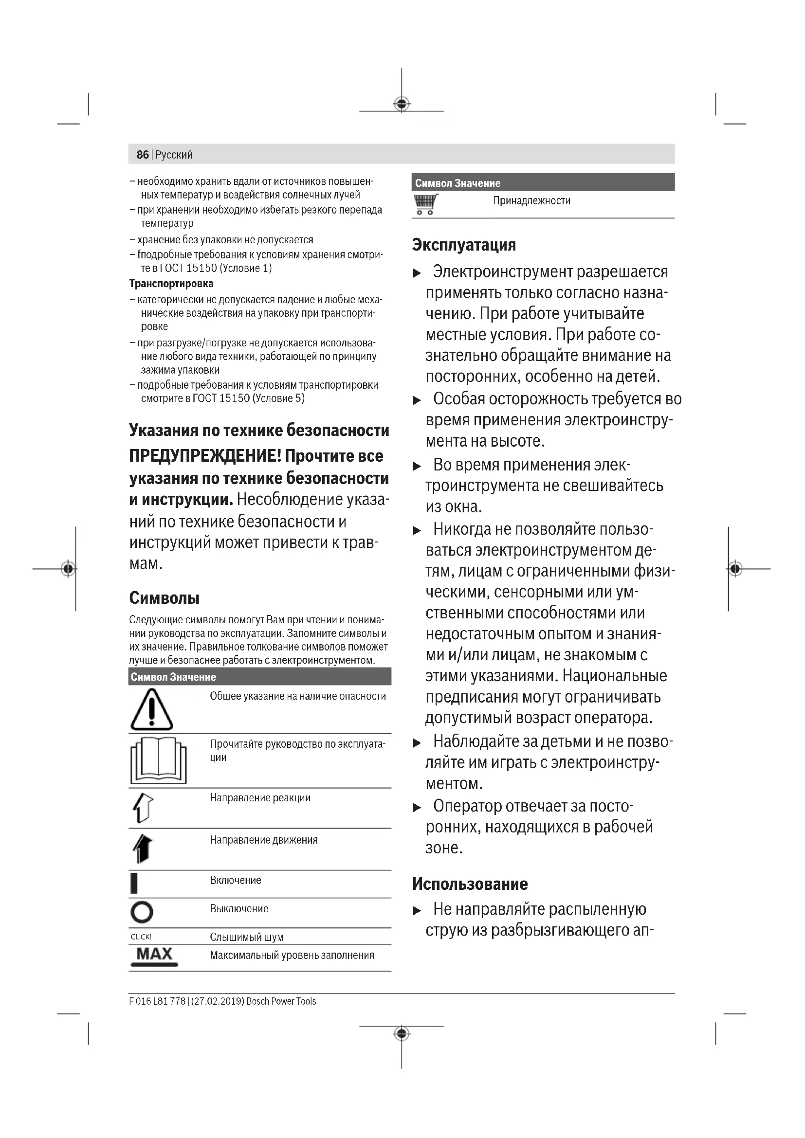 – необходимо хранить в сухом месте Bosch Power Tools F 016 L81 778 | (27.02.2019)86 | Русский – необходимо хранить вдали от источников повышен- ных температур и воздействия солнечных лучей – при хранении необходимо избегать резкого перепада