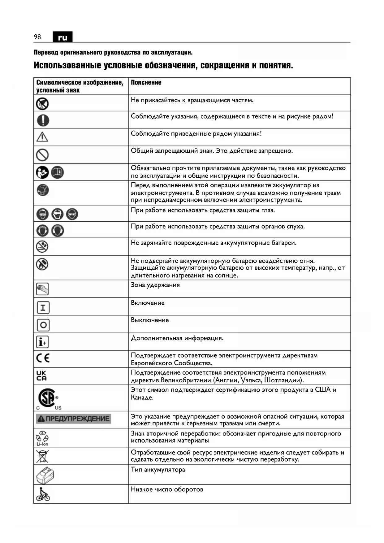 Перевод оригинального руководства по эксплуатации. Использованные условные обозначения, сокращения и понятия. Символическое изображение, условный знак