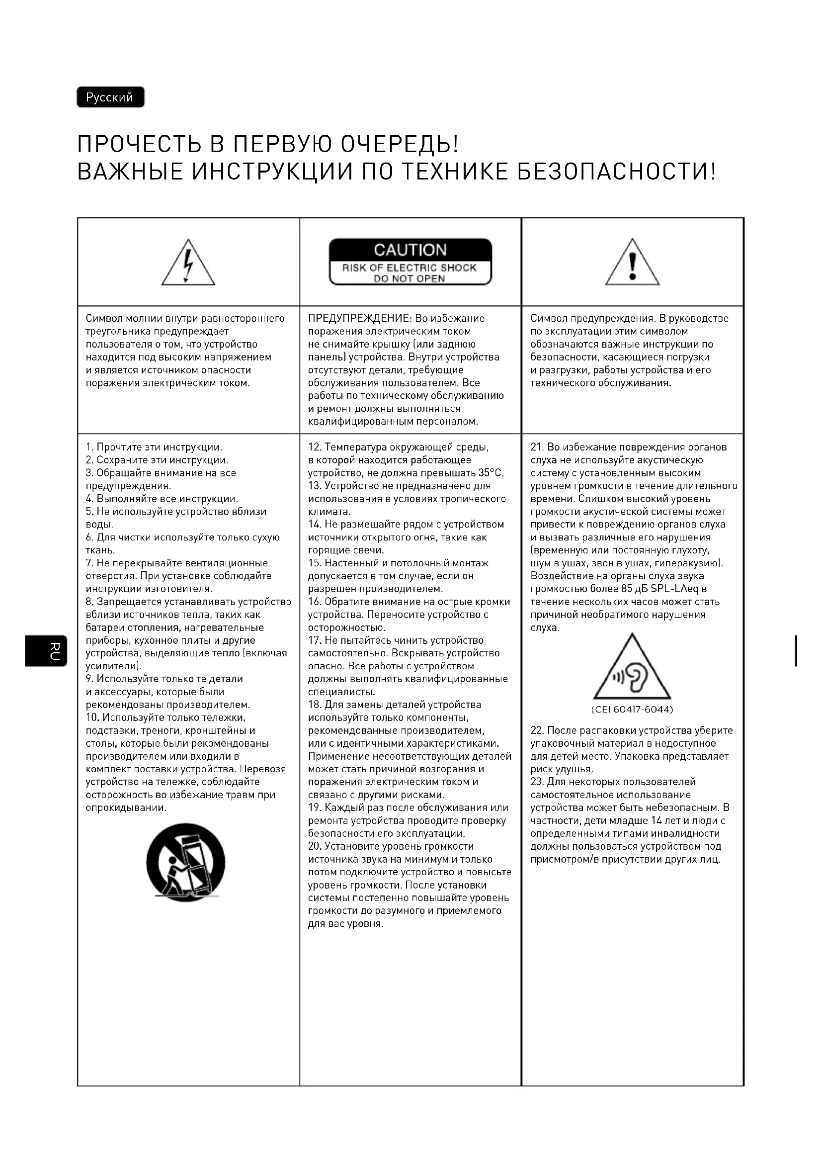 слуха не используйте акустическую систему с установленным высоким уровнем громкости в течение длительного времени. Слишком высокий уровень громкости акустической системы может привести к повреждению органов слуха и вызвать различные его нарушения (временную или постоянную глухоту, шум в ушах, звон в ушах, гиперакузию). Воздействие на органы слуха звука громкостью более 85дБ SPL-LAeq в течение нескольких часов может стать причиной необратимого нарушения