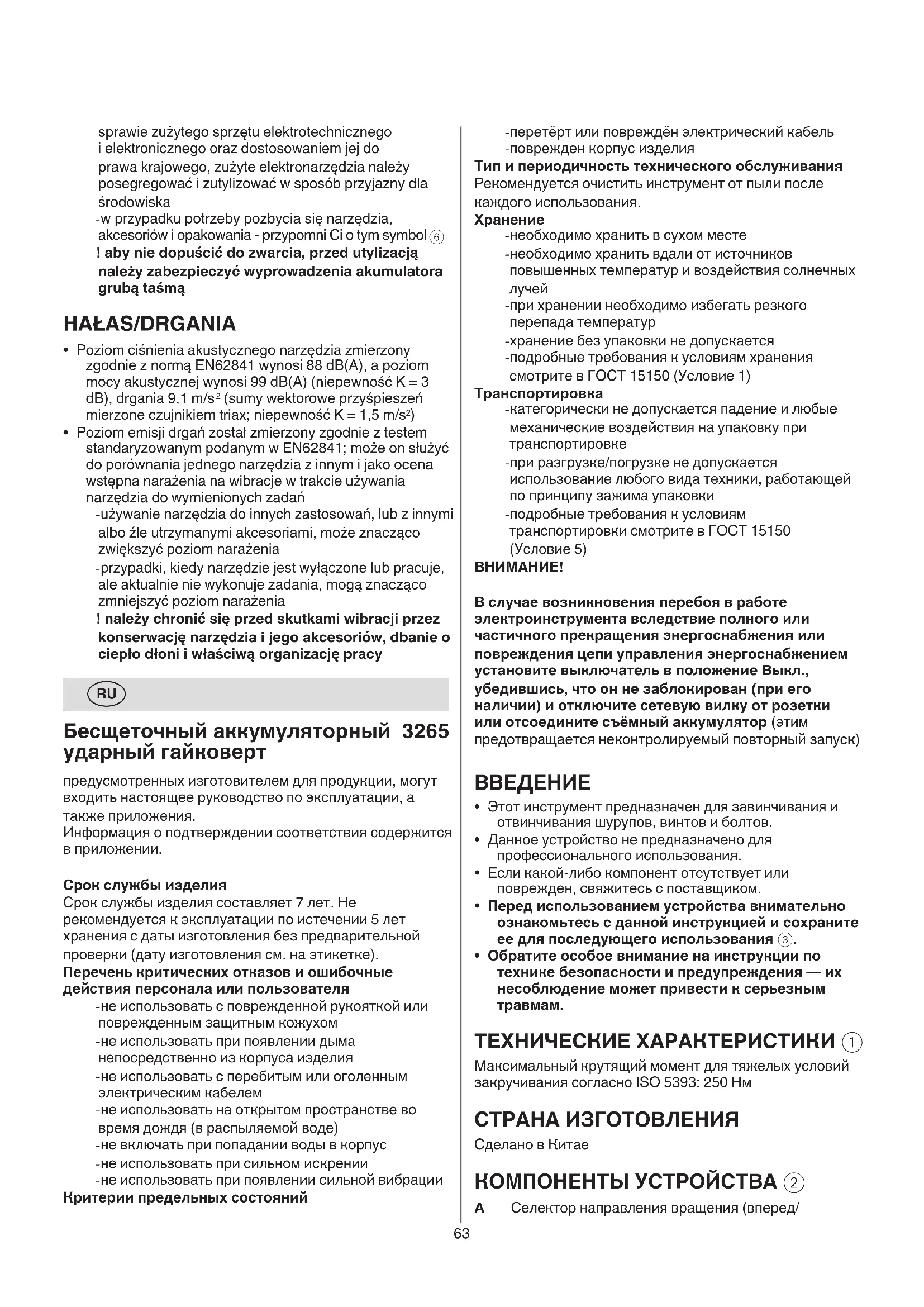предусмотренных изготовителем для продукции, могут входить настоящее руководство по эксплуатации, а также приложения. Информация о подтверждении соответствия содержится в приложении. Срок службы изделия Срок службы изделия составляет 7 лет. Не рекомендуется к эксплуатации по истечении 5 лет хранения с даты изготовления без предварительной проверки (дату изготовления см. на этикетке). Перечень критических отказов и ошибочные действия персонала или пользователя - не использовать с поврежденной рукояткой или поврежденным защитным кожухом - не использовать при появлении дыма непосредственно из корпуса изделия - не использовать с перебитым или оголенным электрическим кабелем - не использовать на открытом пространстве во время дождя (в распыляемой воде) - не включать при попадании воды в корпус - не использовать при сильном искрении - не использовать при появлении сильной вибрации Критерии предельных состояний64 поражения электрическим током. d) Обращайтесь с кабелем аккуратно. Никогда не переносите, не тяните и не выключайте электроинструмент за кабель. Держите кабель подальше от источников тепла, масла, острых предметов или движущихся частей. Поврежденные или запутанные кабели повышают риск поражения электрическим током. e) Для работы с электроинструментом вне помещения используйте предназначенный для этого удлинительный кабель. Использование кабеля, подходящего для использования вне помещения, снижает риск поражения электрическим