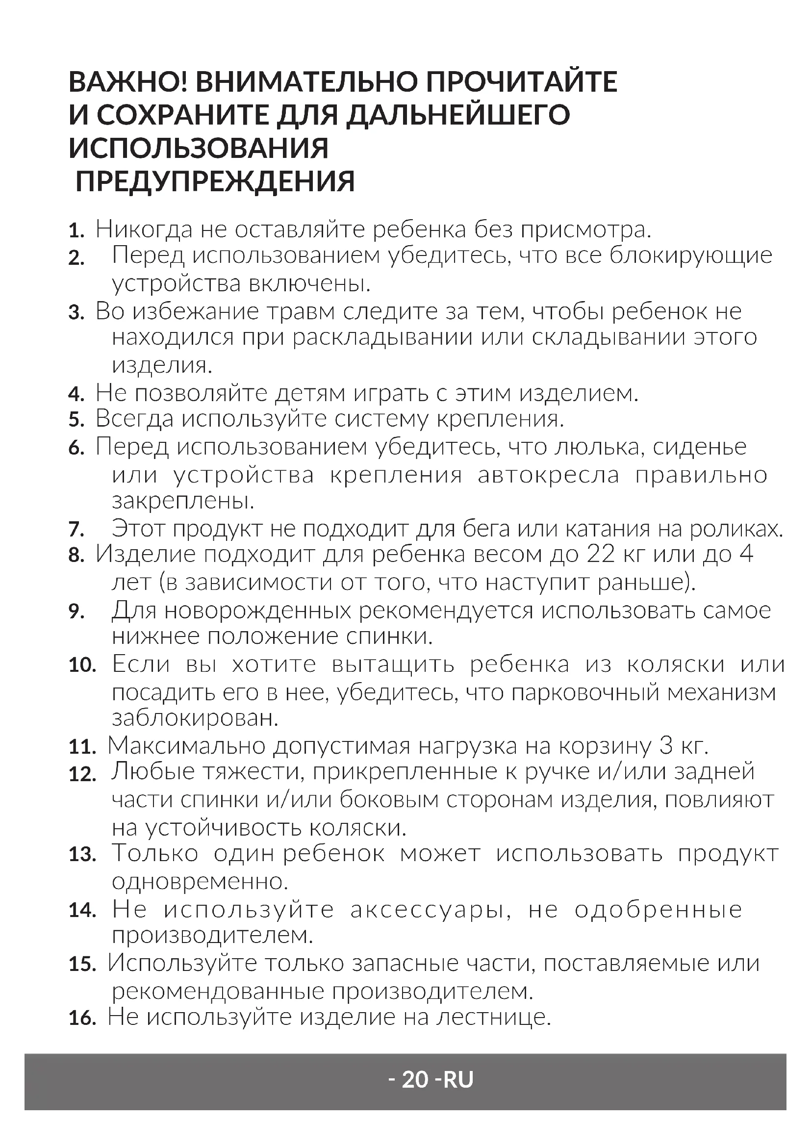 Регулярно проверяйте состояние коляски и колес. Не используйте аксессуары, не входящие в комплект. Используйте только оригинальные запасные части.