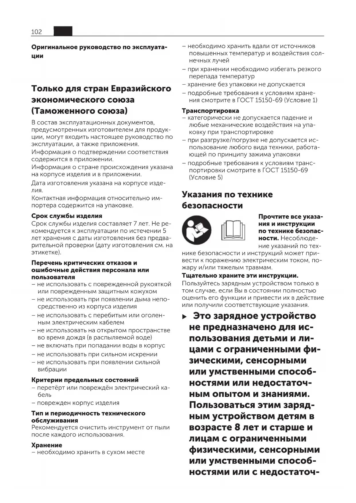 – необходимо хранить в сухом месте – необходимо хранить вдали от источников повышенных температур и воздействия сол- нечных лучей – при хранении необходимо избегать резкого перепада температур – хранение без упаковки не допускается – подробные требования к условиям хране- ния смотрите в ГОСТ15150-69 (Условие1) Транспортировка – категорически не допускается падение и любые механические воздействия на упа- ковку при транспортировке – при разгрузке/погрузке не допускается ис- пользование любого вида техники, работа- ющей по принципу зажима упаковки – подробные требования к условиям транс- портировки смотрите в ГОСТ 15150-69 (Условие 5) Указания по технике безопасностиРусский Прочтите все указа- ния и инструкции по технике безопас- ности. Несоблюде- ние указаний по тех- нике безопасности и инструкций может при- вести к поражению электрическим током, по- жару и/или тяжелым травмам. Тщательно храните эти инструкции. Пользуйтесь зарядным устройством только в том случае, если Вы в состоянии полностью оценить его функции и привести их в действие или получили соответствующие указания. u Это зарядное устройство не предназначено для ис- пользования детьми и ли- цами с ограниченными фи- зическими, сенсорными или умственными способ- ностями или недостаточ- ным опытом и знаниями. Пользоваться этим заряд- ным устройством детям в возрасте 8 лет и старше и лицам с ограниченными физическими, сенсорными или умственными способ- ностями или с недостаточ- 102 ru 34101366060 • 1.6.22ным опытом и знаниями разрешается только под присмотром ответственно- го за их безопасность лица или если они прошли инструктаж на предмет на- дежного использования за- рядного устройства и по- нимают, какие опасности исходят от него. Иначе су- ществует опасность непра- вильного использования или получения травм. u Присматривайте за детьми во время пользования, при выполнении очистки и тех- обслуживания. При этом следите за тем, чтобы дети не играли зарядным устрой-