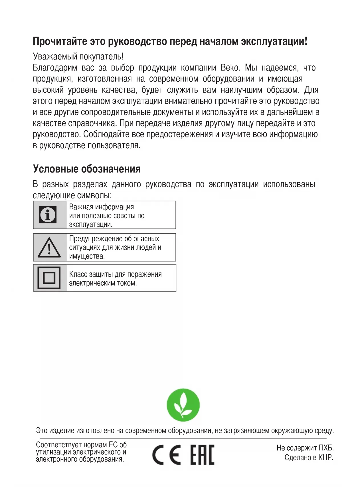 - Cihazın düşürülmesi durumunda cihaz çalışmayabilir veya kalıcı hasar oluşabilir. 4 Temizlik ve bakımЭто изделие изготовлено на современном оборудовании, не загрязняющем окружающую среду. Соответствует нормам ЕС об утилизации электрического и электронного оборудования. Не содержит ПХБ. Сделано в КНР. Прочитайте это руководство перед началом эксплуатации! Уважаемый покупатель! Благодарим вас за выбор продукции компании Beko. Мы надеемся, что продукция, изготовленная на современном оборудовании и имеющая высокий уровень качества, будет служить вам наилучшим образом. Для этого перед началом эксплуатации внимательно прочитайте это руководство и все другие сопроводительные документы и используйте их в дальнейшем в качестве справочника. При передаче изделия другому лицу передайте и это руководство. Соблюдайте все предостережения и изучите всю информацию в руководстве пользователя. Условные обозначения В разных разделах данного руководства по эксплуатации использованы следующие символы: