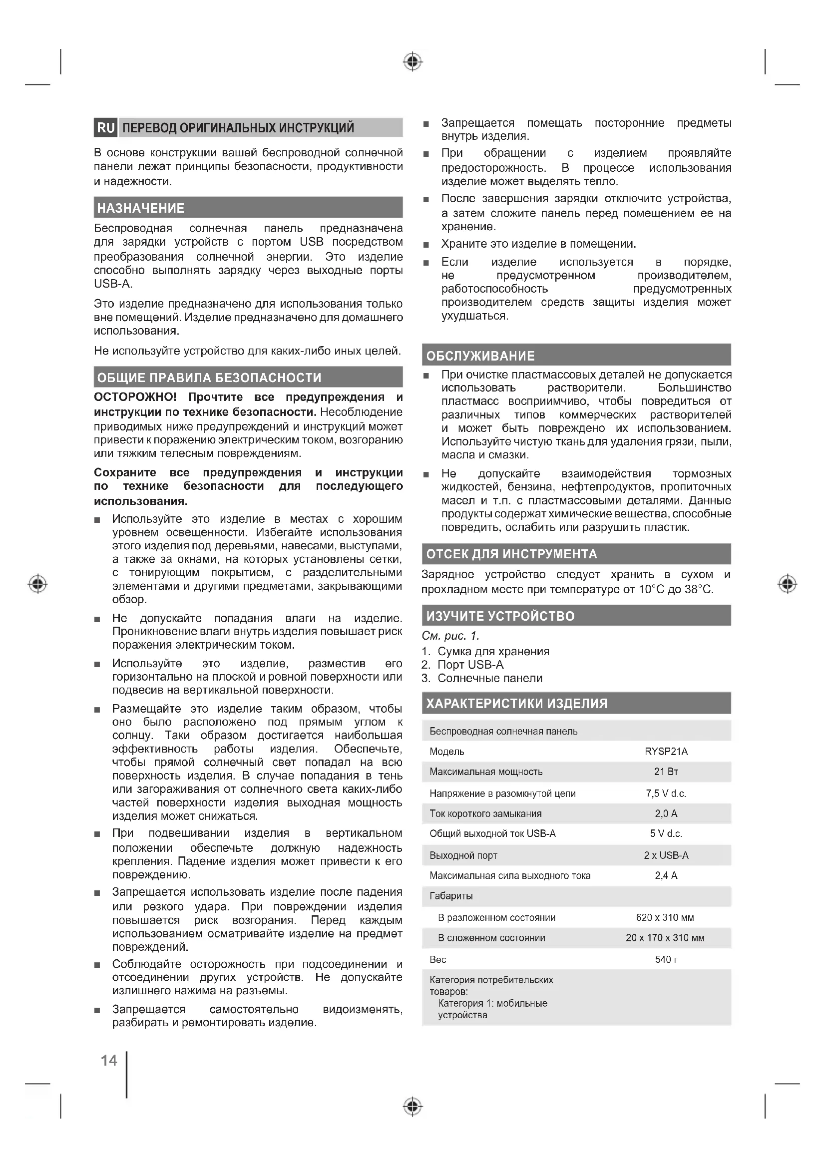ХАРАКТЕРИСТИКИ ИЗДЕЛИЯ Беспроводная солнечная панель Модель RYSP21A Максимальная мощность 21 Вт Напряжение в разомкнутой цепи 7,5 V d.c. Ток короткого замыкания 2,0 А Общий выходной ток USB-A 5 V d.c. Выходной порт 2 x USB-A Максимальная сила выходного тока 2,4 А