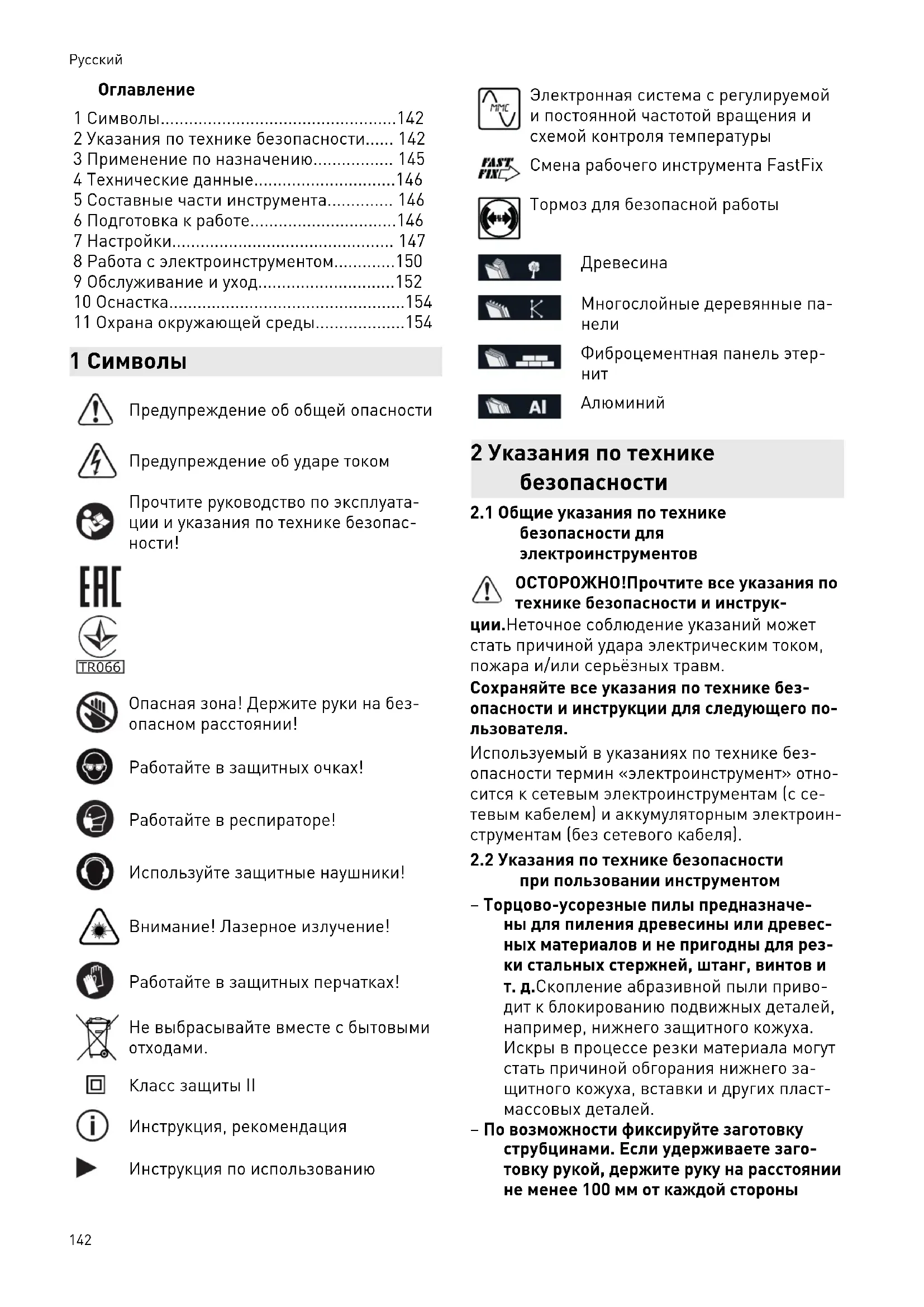 В зависимости от способа использования инструмента и особенно от вида обрабаты ваемого материала показатели создавае мого им рабочего шума могут отличаться от указанных в паспорте изделия. ► За основу для определения мер по охра не труда работников берите фактический уровень шума на рабочем месте. (При этом учитывайте все параметры техноло гического цикла, например периоды, ко гда электроинструмент выключен и когда включён, но не находится в работе.) 3 Применение по назначению Данный электроинструмент является стацио нарным и предназначен для резки деревян ных, пластиковых или алюминиевых профи лей и сравнимых с ними материалов. Нельзя обрабатывать другие материалы, в частности сталь, бетон и минеральные материалы. Используйте только пильные диски Festool, предназначенные для данного электроин
