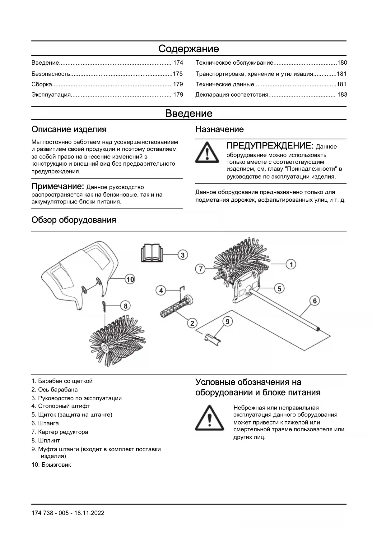 ПРЕДУПРЕЖДЕНИЕ: Данное оборудование можно использовать только вместе с соответствующим изделием, см. главу "Принадлежности" в руководстве по эксплуатации изделия. Данное оборудование предназначено только для подметания дорожек, асфальтированных улиц и т.д. Обзор оборудования