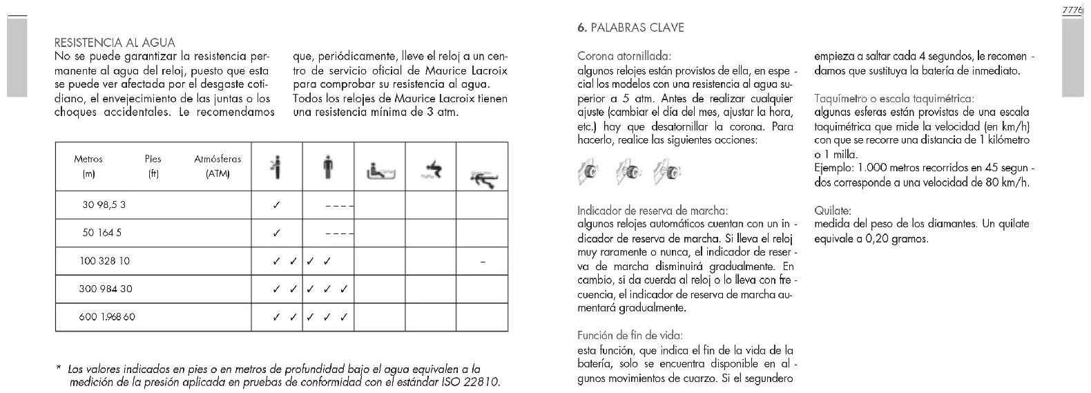 - Значения глубины погружения в метрах или футах эквивалентны показателям давления во время испытаний по стандарту ISO 22810. ВОДОНЕПРОНИЦАЕМОСТЬ Водонепроницаемость не может быть гарантиро- вана навсегда. Ежедневный износ, старение про- кладок и случайные удары отрицательно влияют на водонепроницаемость часов. Мы рекомендуем регулярно проверять водонепроницаемость часов в уполномоченном сервисном центре Maurice Lacroix. Все часы Maurice Lacroix водонепроницаемы как минимум до 3 атмосфер (атм).