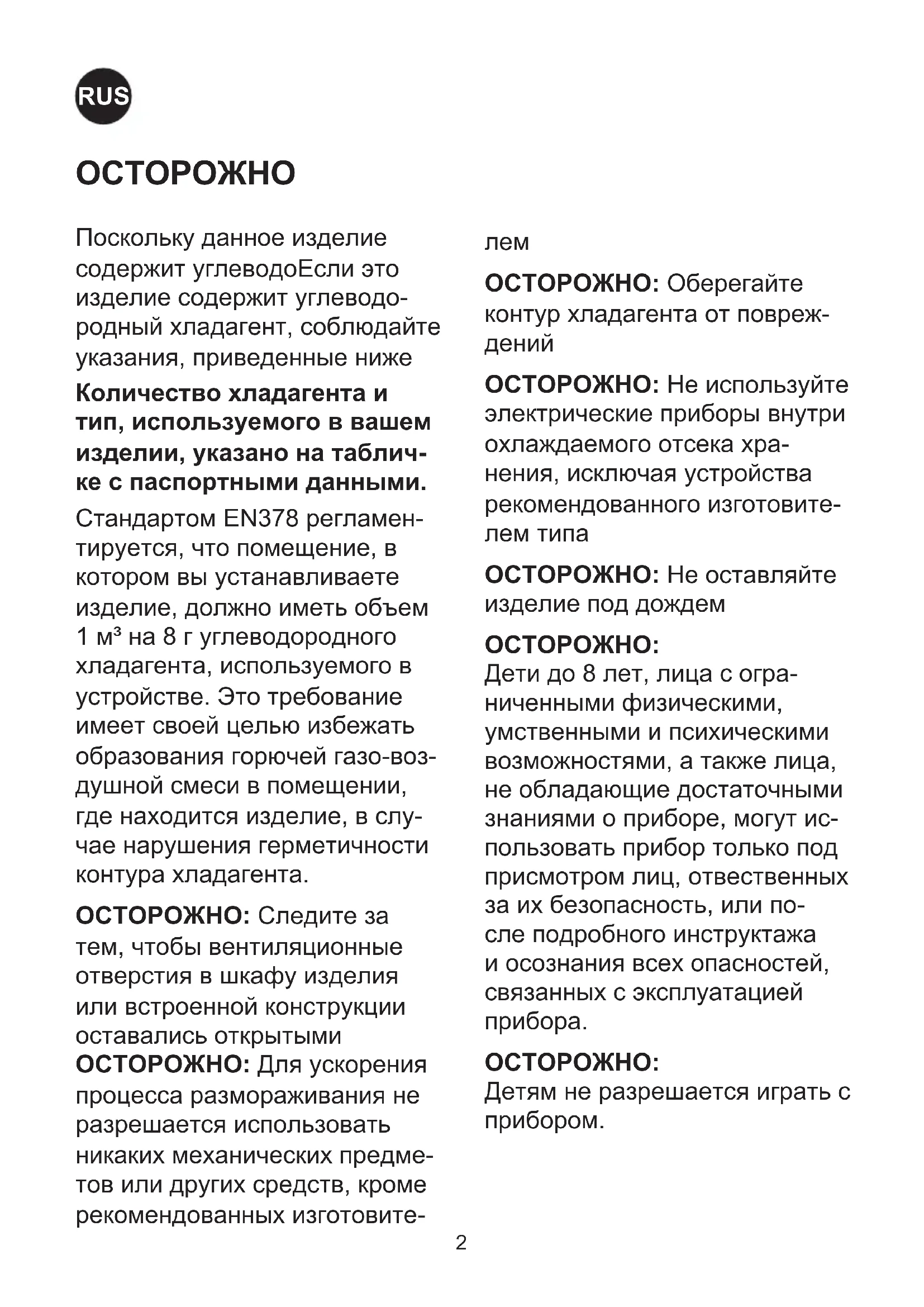 Поскольку данное изделие содержит углеводоЕсли это изделие содержит углеводо- родный хладагент, соблюдайте указания, приведенные ниже Количествохладагентаи тип,используемоговвашем изделии,указанонатаблич- кеспаспортнымиданными. Стандартом EN378 регламен- тируется, что помещение, в котором вы устанавливаете изделие, должно иметь объем 1 м³ на 8 г углеводородного хладагента, используемого в устройстве. Это требование имеет своей целью избежать образования горючей газо-воз- душной смеси в помещении, где находится изделие, в слу- чае нарушения герметичности контура хладагента. ОСТОРОЖНО:Следите за тем, чтобы вентиляционные отверстия в шкафу изделия или встроенной конструкции оставались открытыми ОСТОРОЖНО:Для ускорения процесса размораживания не разрешается использовать никаких механических предме- тов или других средств, кроме рекомендованных изготовите-