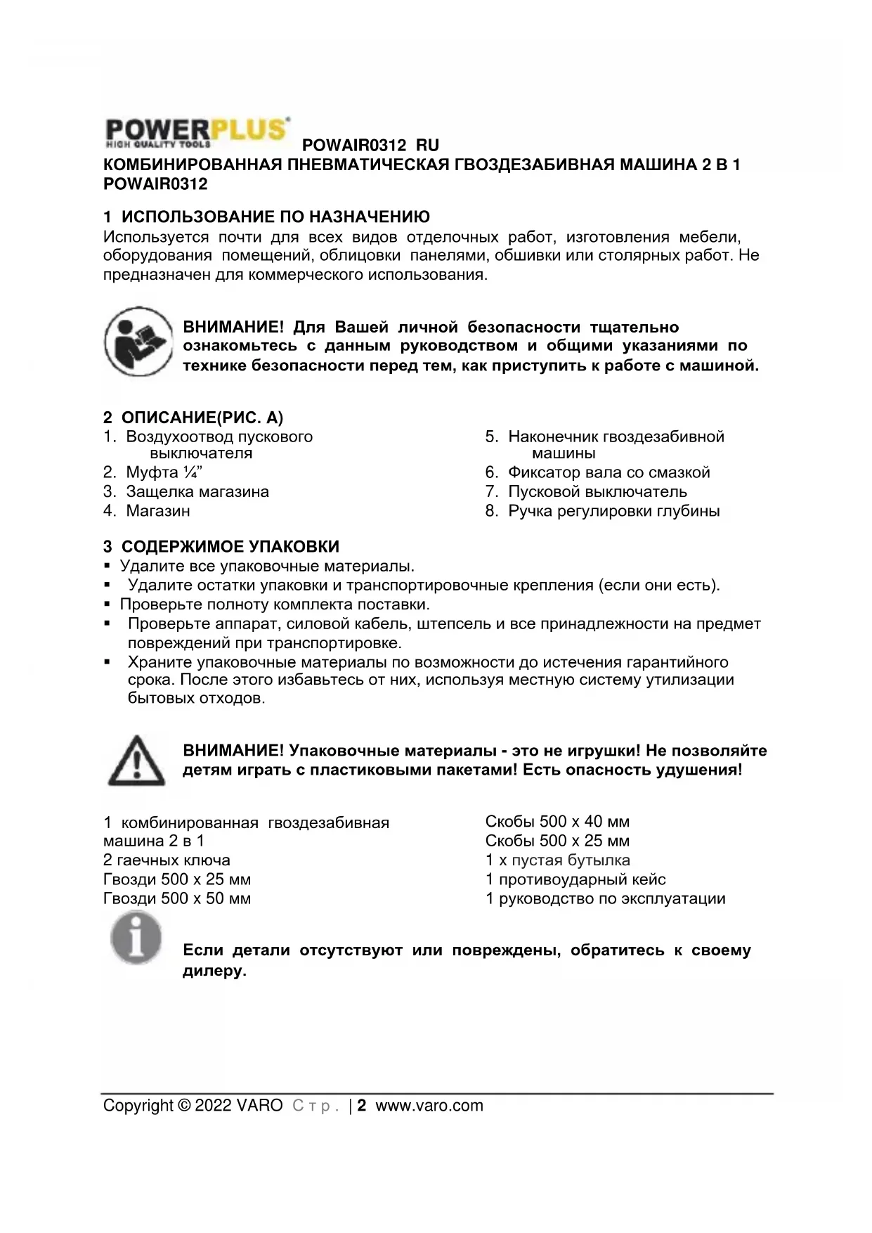 14 ГАРАНТИЯ ....................................................................................................12 15 ОКРУЖАЮЩАЯ СРЕДА ..............................................................................14 16 ДЕКЛАРАЦИЯ СООТВЕТСТВИЯ ...............................................................14POWAIR0312 RU Copyright © 2022 VARO С т р . | 2 www.varo.com КОМБИНИРОВАННАЯ ПНЕВМАТИЧЕСКАЯ ГВОЗДЕЗАБИВНАЯ МАШИНА 2 В 1 POWAIR0312 1 ИСПОЛЬЗОВАНИЕ ПО НАЗНАЧЕНИЮ Используется почти для всех видов отделочных работ, изготовления мебели, оборудования помещений, облицовки панелями, обшивки или столярных работ. Не предназначен для коммерческого использования. ВНИМАНИЕ! Для Вашей личной безопасности тщательно ознакомьтесь с данным руководством и общими указаниями по технике безопасности перед тем, как приступить к работе с машиной. 2 ОПИСАНИЕ(РИС. A)