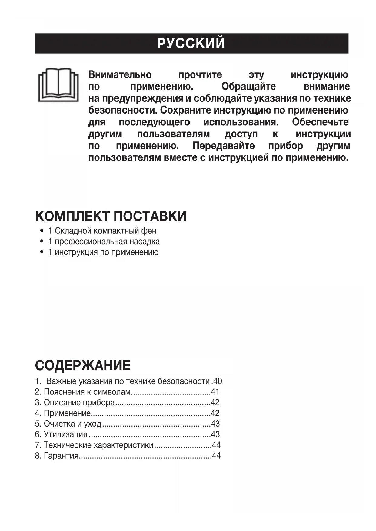 Внимательно прочтите эту инструкцию по применению. Обращайте внимание напредупреждения исоблюдайте указания потехнике безопасности. Сохраните инструкцию поприменению для последующего использования. Обеспечьте другим пользователям доступ к инструкции по применению. Передавайте прибор другим пользователям вместе синструкцией поприменению.