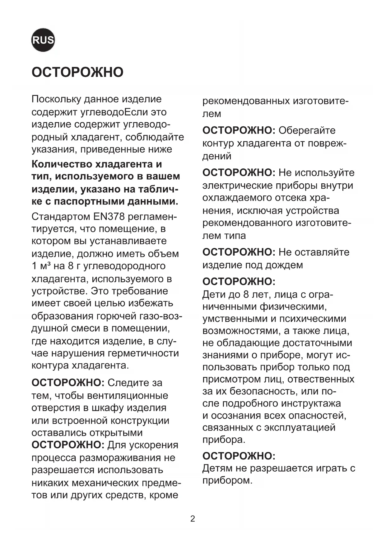 Поскольку данное изделие содержит углеводоЕсли это изделие содержит углеводо- родный хладагент, соблюдайте указания, приведенные ниже Количествохладагентаи тип,используемоговвашем изделии,указанонатаблич- кеспаспортнымиданными. Стандартом EN378 регламен- тируется, что помещение, в котором вы устанавливаете изделие, должно иметь объем 1 м³ на 8 г углеводородного хладагента, используемого в устройстве. Это требование имеет своей целью избежать образования горючей газо-воз- душной смеси в помещении, где находится изделие, в слу- чае нарушения герметичности контура хладагента. ОСТОРОЖНО:Следите за тем, чтобы вентиляционные отверстия в шкафу изделия или встроенной конструкции оставались открытыми ОСТОРОЖНО:Для ускорения процесса размораживания не разрешается использовать никаких механических предме- тов или других средств, кроме