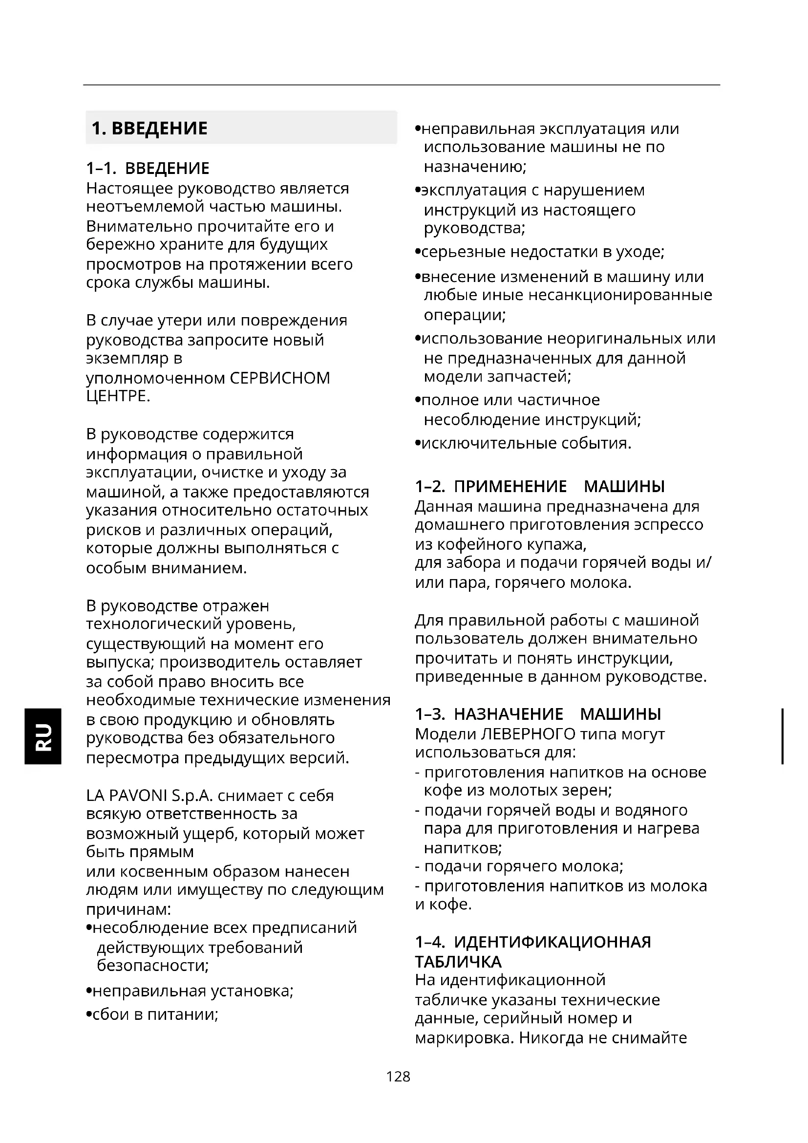 В руководстве содержится информация о правильной эксплуатации, очистке и уходу за машиной, а также предоставляются указания относительно остаточных рисков и различных операций, которые должны выполняться с особым вниманием. В руководстве отражен технологический уровень, существующий на момент его выпуска; производитель оставляет за собой право вносить все необходимые технические изменения в свою продукцию и обновлять руководства без обязательного пересмотра предыдущих версий. LA PAVONI S.p.A. снимает с себя всякую ответственность за возможный ущерб, который может быть прямым или косвенным образом нанесен людям или имуществу по следующим