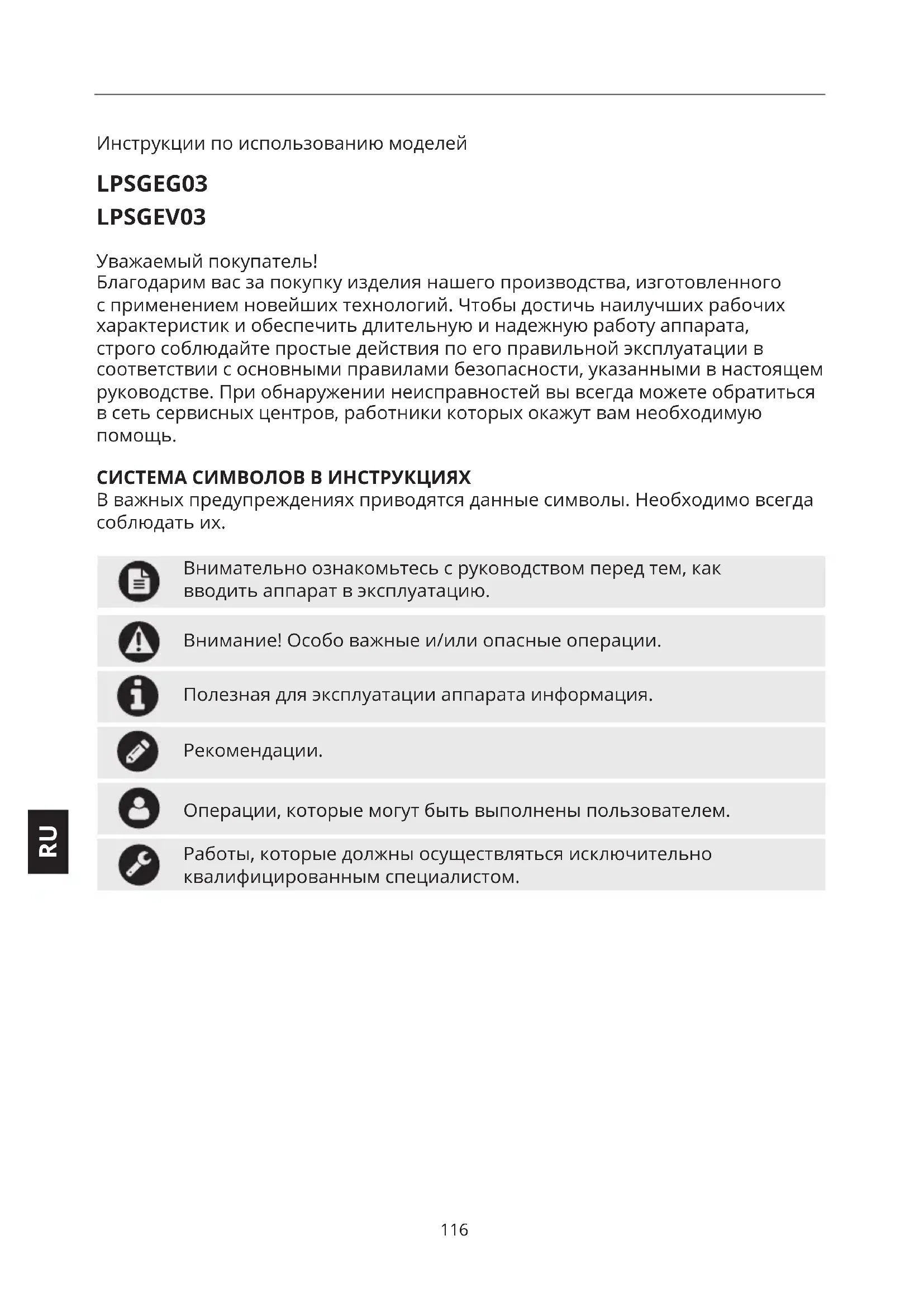Инструкции по использованию моделей LPSGEG03 LPSGEV03 Уважаемый покупатель! Благодарим вас за покупку изделия нашего производства, изготовленного с применением новейших технологий. Чтобы достичь наилучших рабочих характеристик и обеспечить длительную и надежную работу аппарата, строго соблюдайте простые действия по его правильной эксплуатации в соответствии с основными правилами безопасности, указанными в настоящем руководстве. При обнаружении неисправностей вы всегда можете обратиться в сеть сервисных центров, работники которых окажут вам необходимую