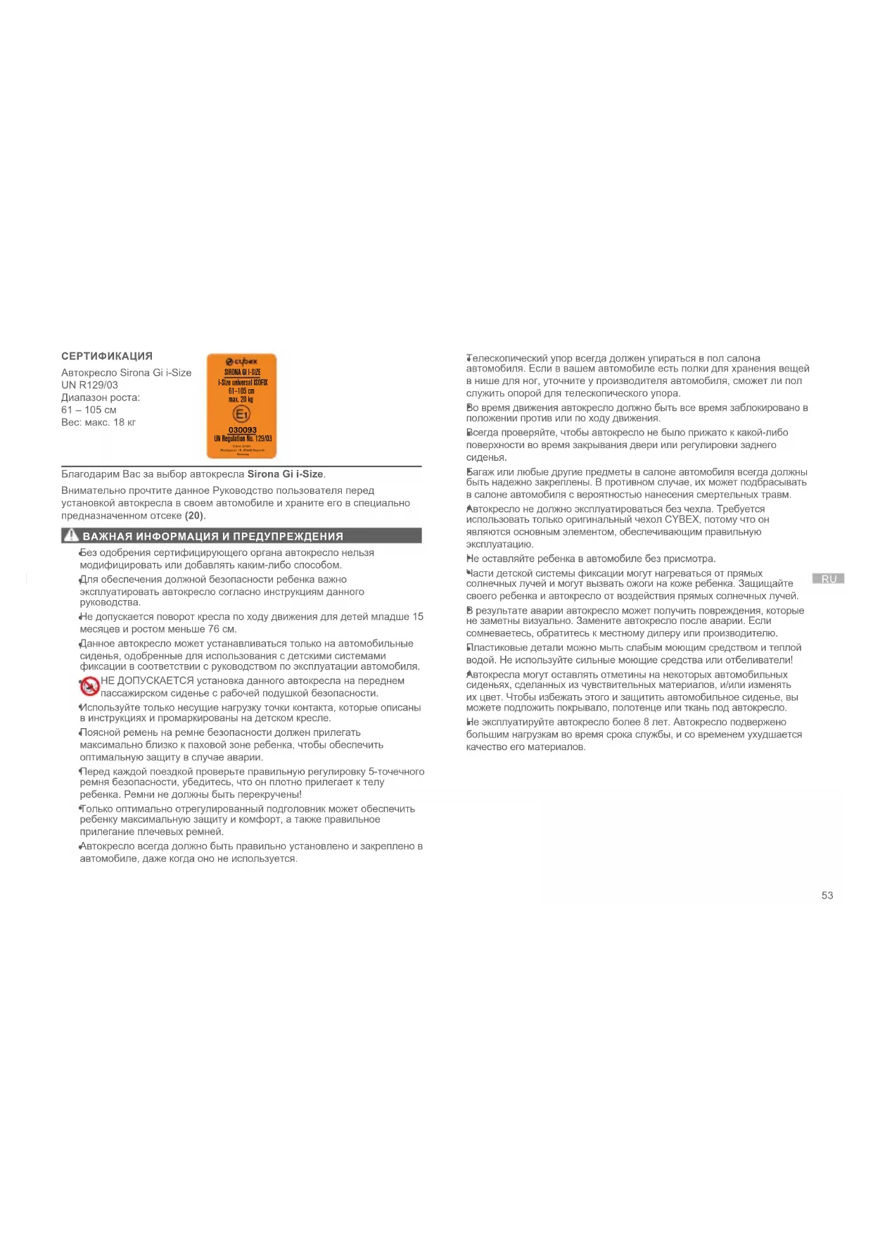 UN Regulation No. 129/03 Cybex GmbH Riedingerstr. 18, 95448 Bayreuth Germany Благодарим Вас за выбор автокресла Sirona Gi i-Size. Внимательно прочтите данное Руководство пользователя перед установкой автокресла в своем автомобиле и храните его в специально предназначенном отсеке (20). ВАЖНАЯ ИНФОРМАЦИЯ И ПРЕДУПРЕЖДЕНИЯ