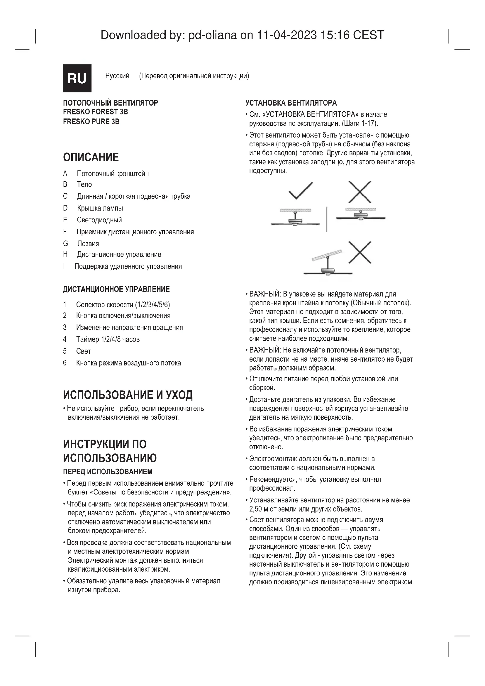 A Потолочныйкронштейн B Тело C Длинная/короткаяподвеснаятрубка D Крышкалампы E Светодиодный F Приемникдистанционногоуправления G Лезвия H Дистанционноеуправление I Поддержкаудаленногоуправления ДИСТАНЦИОННОЕ УПРАВЛЕНИЕ 1 Селекторскорости(1/2/3/4/5/6) 2 Кнопкавключения/выключения 3 Изменениенаправлениявращения 4 Таймер1/2/4/8часов 5 Свет 6 Кнопкарежимавоздушногопотока ИСПОЛЬЗОВАНИЕ И УХОД