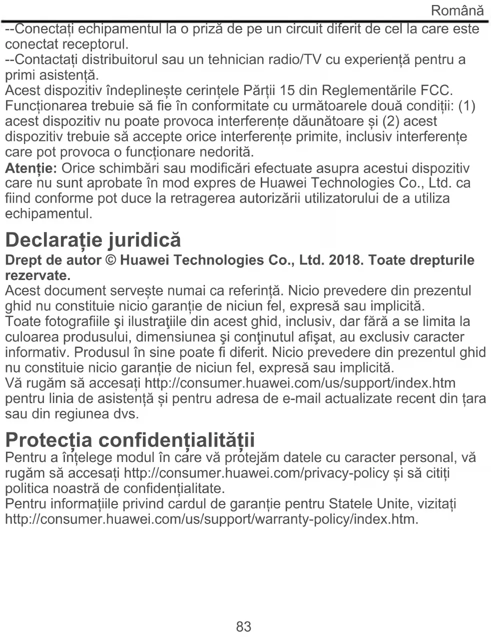 Данный документ носит справочный характер. Положения настоящего руководства не подразумевают никаких гарантий, явных или неявных. Все изображения в данном руководстве, включая цвет и размер устройства, а также изображения на экране, приведены для справки. Приобретенный продукт может отличаться от изображенного в данном руководстве. Положения настоящего руководства не подразумевают никаких гарантий, явных или неявных. Информацию о телефоне горячей линии и адресе электронной почты службы поддержки клиентов в Вашей стране или регионе можно найти на веб-сайте http://consumer.huawei.com/us/support/index.htm. Защита персональных данных Меры, принимаемые компанией Huawei для защиты ваших персональных данных, можно найти на веб-сайте http://consumer.huawei.com/privacy-policy и в политике конфиденциальности. Данные гарантийного талона, действующего в США, см. на веб-сайте http://consumer.huawei.com/us/support/warranty-policy/index.htm.Русский