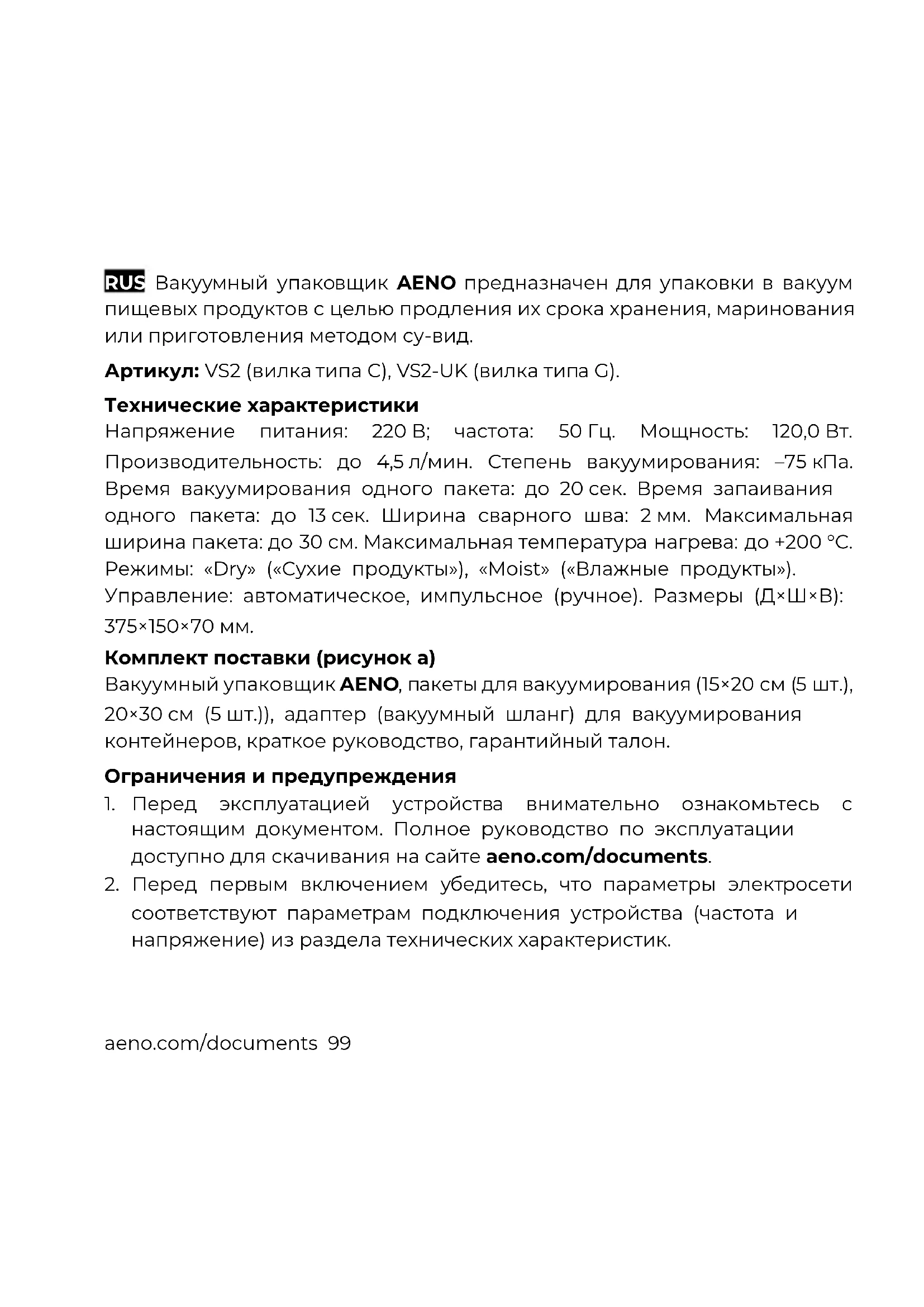 VS2 - вакуумные упаковочные машины AENO - Бесплатное руководство пользователя