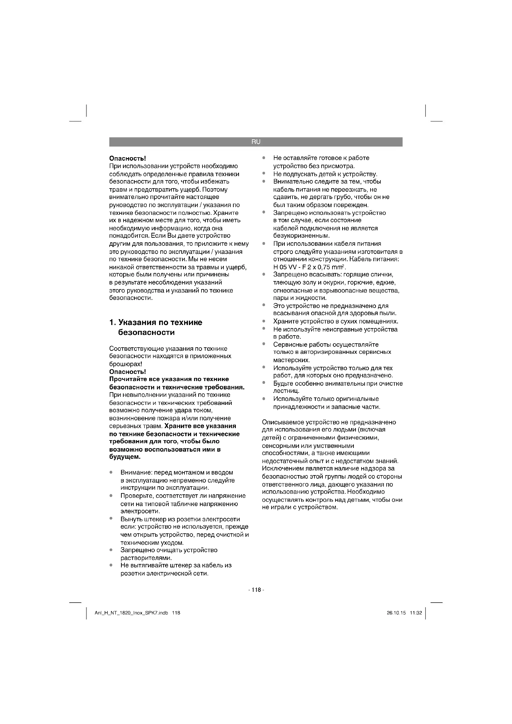 Пылесос для влажной и сухой очистки может быть использован для влажной и сухой уборки с использованием соответствующего фильтра. Устройство не предназначено для всасывания горючих, взрывчатых или опасных для здоровья веществ. Аппарат разрешается использовать только по назначению. Любое другое выходящее за эти рамки применение считается использованием не по назначению. За возникший в результате этого материальный ущерб или травмы любого рода несет ответственность пользователь/оператор, а не производитель. Учтите, что конструкция наших устройств не предназначена для использования в промышленных целях, в ремесленном или кустарном производстве. Мы не несем никакой ответственности по гарантийным обязательствам в случае применения устройства на ремесленных, кустарных или промышленных предприятиях, а также для подобных целей. Anl_H_NT_1820_Inox_SPK7.indb 119Anl_H_NT_1820_Inox_SPK7.indb 119 26.10.15 11:3226.10.15 11:32RU