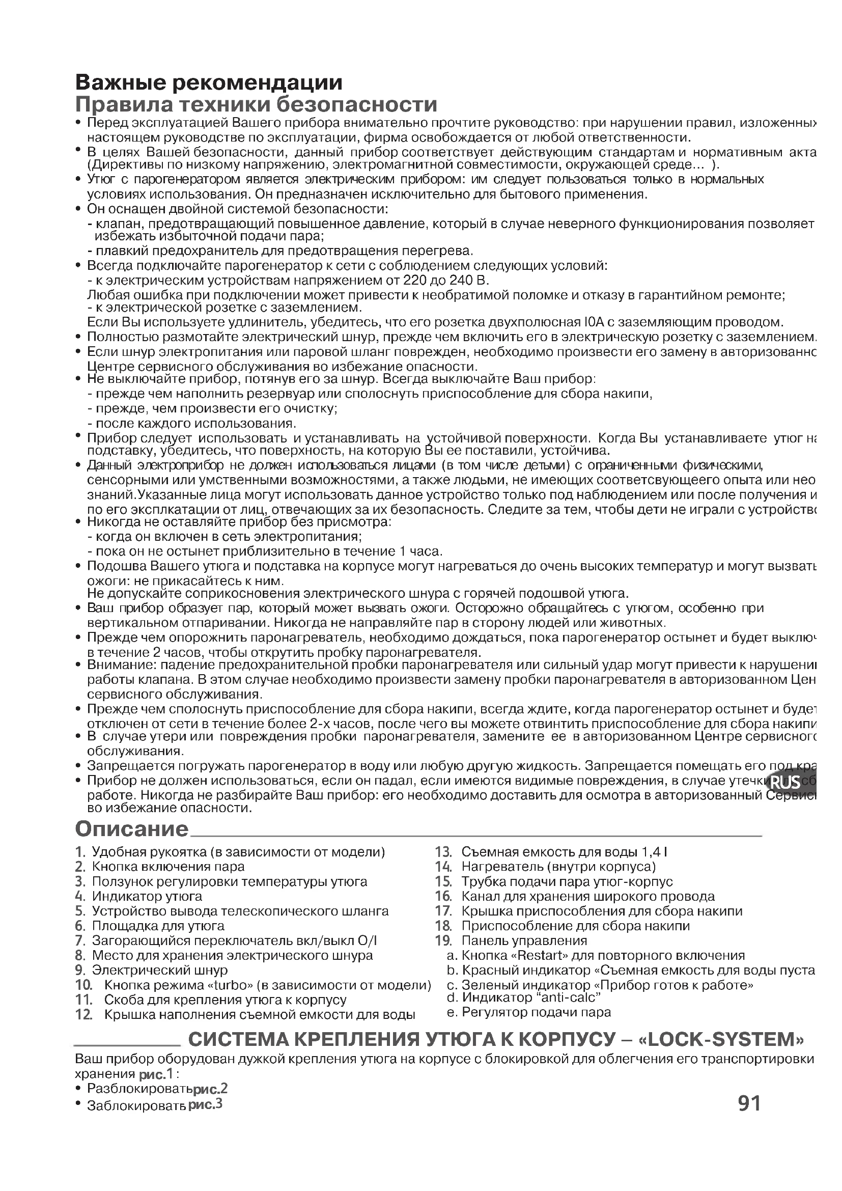 СИСТЕМА КРЕПЛЕНИЯ УТЮГА К КОРПУСУ – «LOCK-SYSTEM» Ваш прибор оборудован дужкой крепления утюга на корпусе с блокировкой для облегчения его транспортировки и