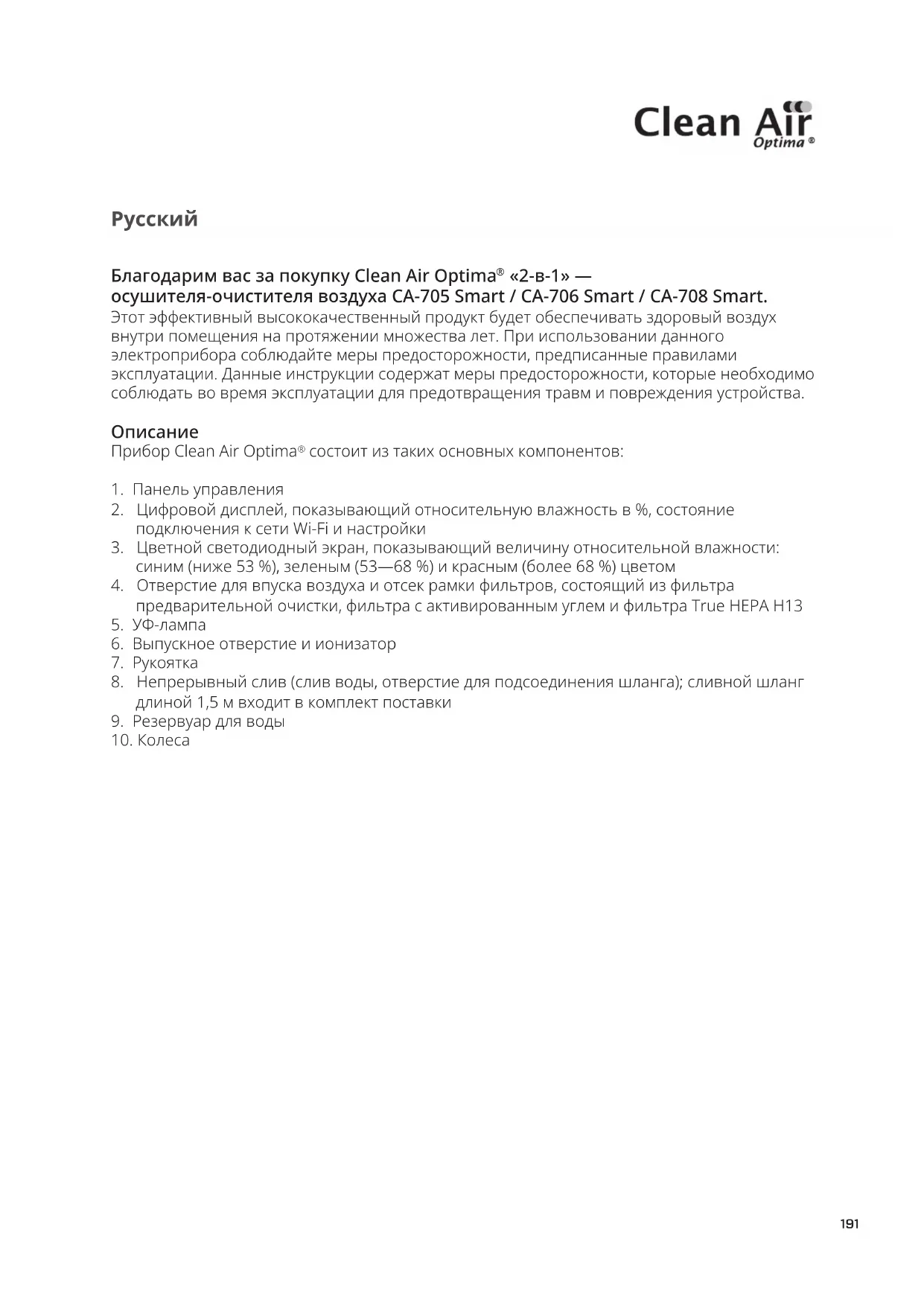 можноознакомиться на сайте www.youtube.com Clean Air Optima International B.V. | David Ricardostraat 9-7 / 9-9 | 7559 SH Хенгело (Оверэйссел) Нидерланды | Телефон: +31 (0) 74 - 2670145 Clean Air Optima Germany GmbH | Enschedestraße 14 | 48529 Нордхорн | Германия Телефон: +49 (0) 5921 879-121 Эл. почта: info@cleanairoptima.com Веб-сайт: www.cleanairoptima.com207 Главна единица CA-705 Smart / CA-706 Smart / CA-708 Smart208