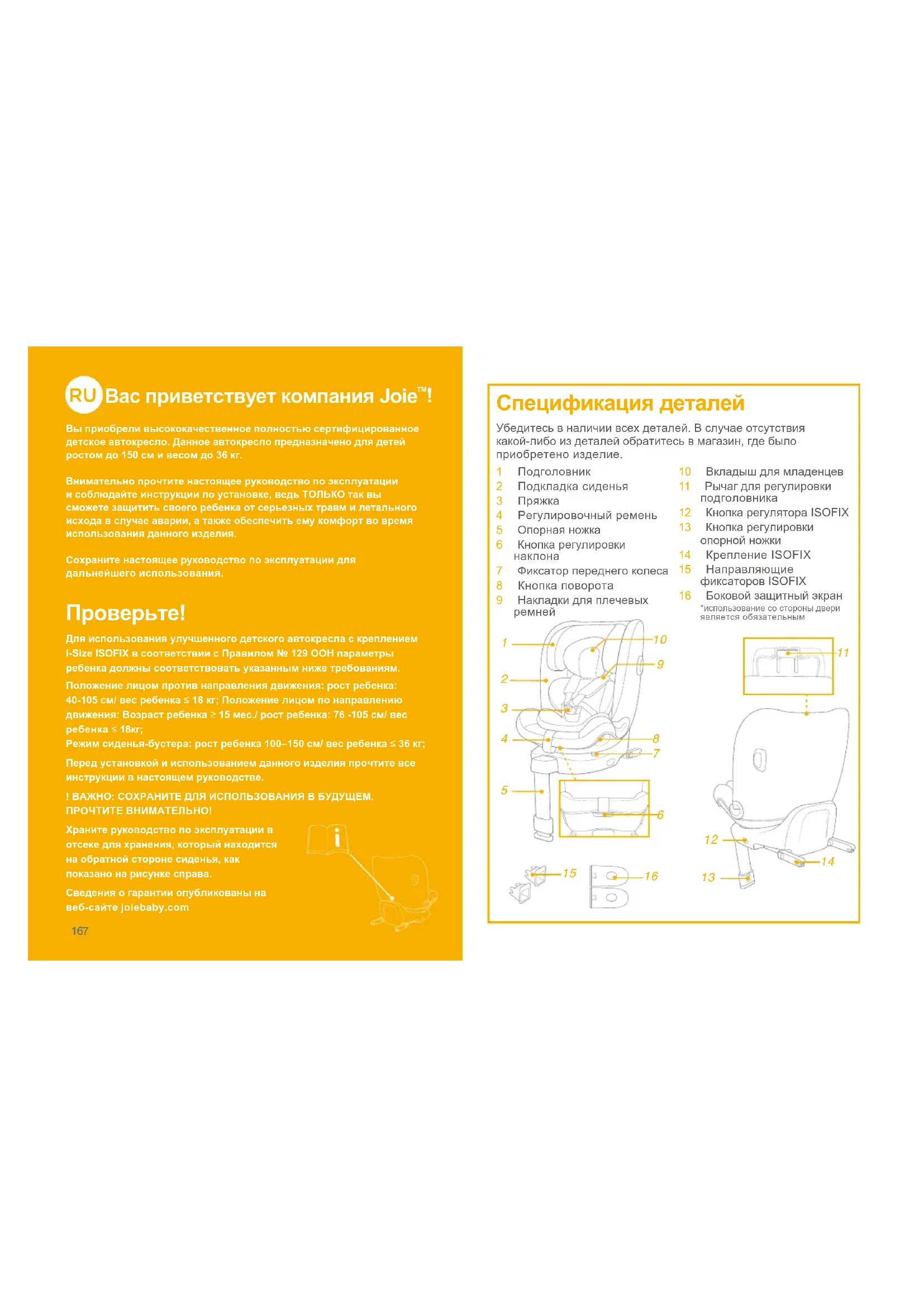 Вы приобрели высококачественное полностью сертифицированное детское автокресло. Данное автокресло предназначено для детей ростом до 150 см и весом до 36 кг.Внимательно прочтите настоящее руководство по эксплуатации и соблюдайте инструкции по установке, ведь ТОЛЬКО так вы сможете защитить своего ребенка от серьезных травм и летального исхода в случае аварии, а также обеспечить ему комфорт во время использования данного изделия.Сохраните настоящее руководство по эксплуатации для дальнейшего использования. Для использования улучшенного детского автокресла с креплением i-Size ISOFIX в соответствии с Правилом № 129 ООН параметры ребенка должны соответствовать указанным ниже требованиям.Положение лицом против направления движения: рост ребенка: 40-105 см/ вес ребенка≤18 кг; Положение лицом по направлению движения: Возраст ребенка ≥ 15 мес./ рост ребенка: 76 -105 см/ вес ребенка ≤18кг; Режим сиденья-бустера: рост ребенка 100–150 см/ вес ребенка ≤36 кг;Перед установкой и использованием данного изделия прочтите все инструкции в настоящем руководстве.! ВАЖНО: СОХРАНИТЕ ДЛЯ ИСПОЛЬЗОВАНИЯ В БУДУЩЕМ. ПРОЧТИТЕ ВНИМАТЕЛЬНО!Храните руководство по эксплуатации в отсеке для хранения, который находится на обратной стороне сиденья, как показано на рисунке справа. Сведения о гарантии опубликованы на веб-сайте joiebaby.com Спецификация деталей 1 Подголовник2 Подкладкасиденья3 Пряжка4 Регулировочныйремень5 Опорнаяножка6 Кнопкарегулировкинаклона7 Фиксаторпереднегоколеса8 Кнопкаповорота9 Накладкидляплечевыхремней10 Вкладышдлямладенцев11 Рычагдлярегулировкиподголовника12 КнопкарегулятораISOFIX13 Кнопкарегулировкиопорнойножки14 КреплениеISOFIX15 НаправляющиефиксаторовISOFIX16 Боковойзащитныйэкран*использованиесостороныдвериявляетсяобязательнымУбедитесьвналичиивсехдеталей.Вслучаеотсутствиякакой-либоиздеталейобратитесьвмагазин,гдебылоприобретеноизделие.